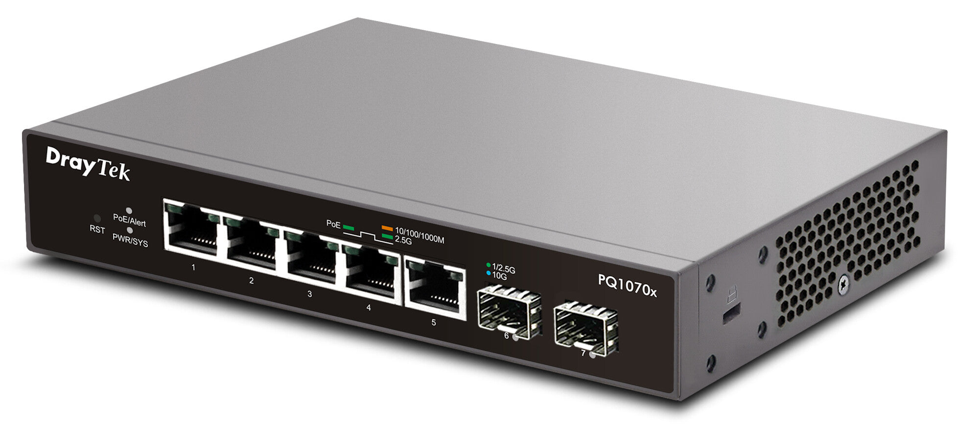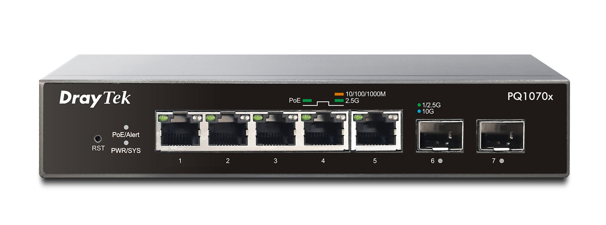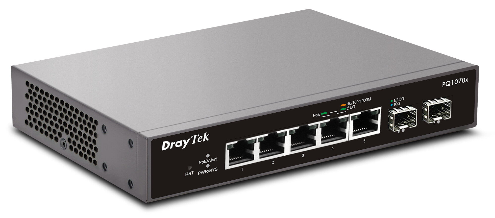 VigorSwitch PQ1070x is a 2.5 Gigabit switch with 5 PoE+ 2.5GbE ports (total of 75W output) and 2 additional independent SFP+ 10Gbps interfaces. Ideal for usage with devices where there are throughput demands beyond 1Gbps such as PoE Wi-Fi 6 access points, high bandwidth video or network attached storage.