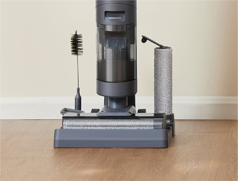 Self-cleaning capability ensures you're washing with a clean brush. Cleans itself as it cleans the floor thanks to a built-in brush scraper. Put the vacuum on the dock and just press the button to thoroughly rinse the roller until it's clean.