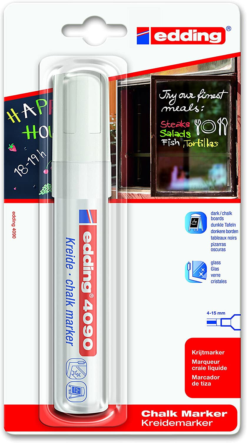 When it comes to non-dusty chalk markings or texts, there is hardly a better solution than the edding 4090 chalk marker. Its extra broad chisel nib releases highly opaque, liquid chalk colours on smooth surfaces like blackboards, mirrors and glass. This edding is not only suitable for creative crafting at home, but also a favourite tool in businesses like restaurants, bars or the glass industry.