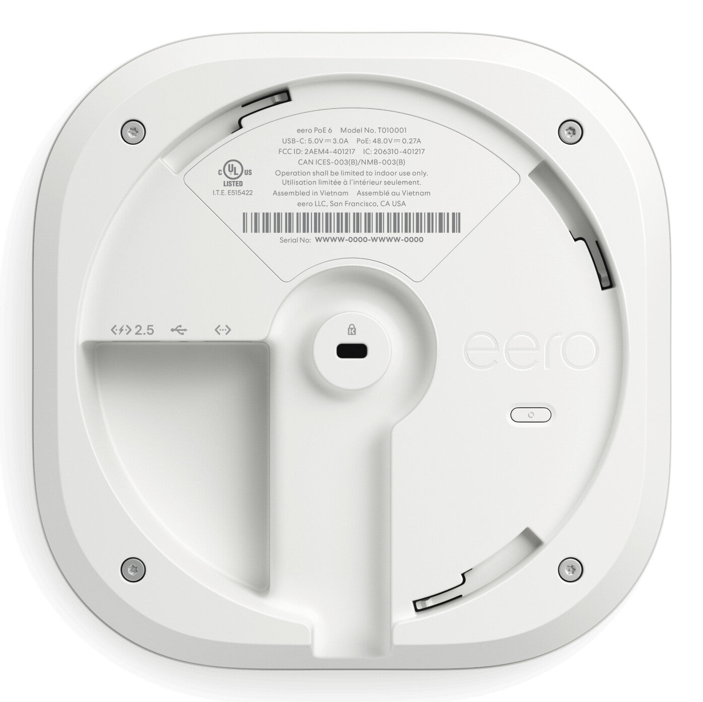 The wall- and ceiling-mountable eero PoE 6 is designed to work with the eero PoE Gateway, a wired router and PoE+ smart network switch that can power up to seven eero PoE 6 devices.