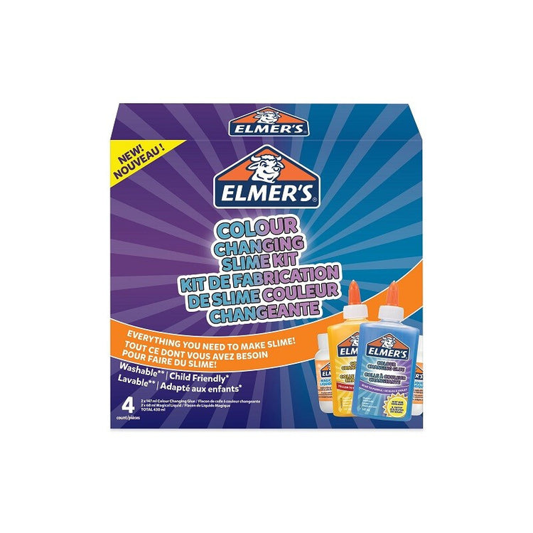 Discover the magic of slime with the Elmer’s Colour Changing Slime Kit that transforms from one colour to the next when exposed to sunlight! Inside, you'll find 1 bottle each of Blue-to-Purple and Yellow-to-Red Glue. It's washable, child-friendly* and flexible when dry; perfect for quick and easy clean-ups. You'll also find 2 bottles of Magical Liquid slime activator solution. Just add to your glue to turn it into slime and avoid the mess of other slime ingredients. *Not for children under 3 years. Adult supervision required. Thoroughly wash your hands before and after making and playing with slime.