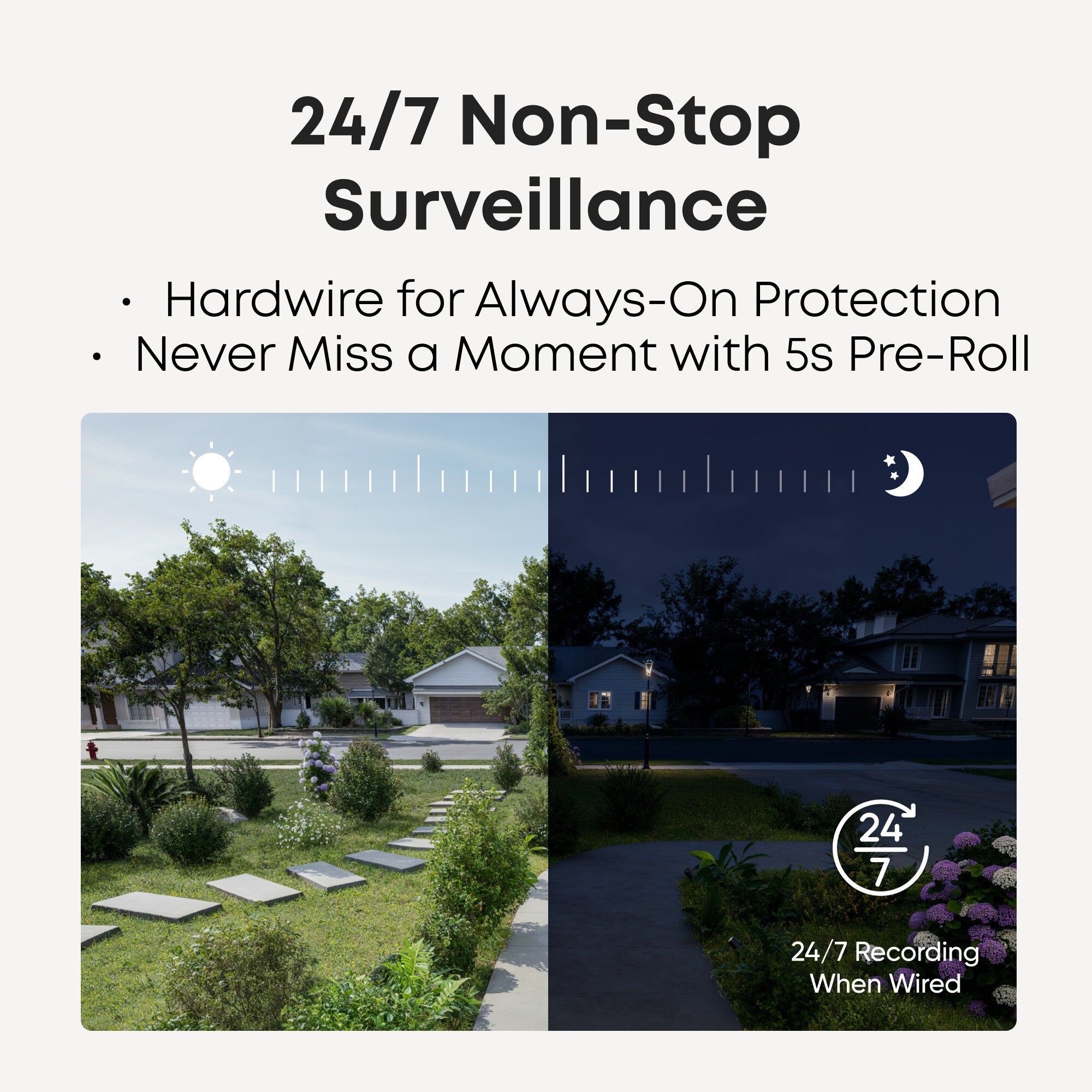 You have two power choices. Choose the rechargeable battery for easy setup or hardwired power for continuous 24/7 recording and 5-second pre-roll for motion-activated events.