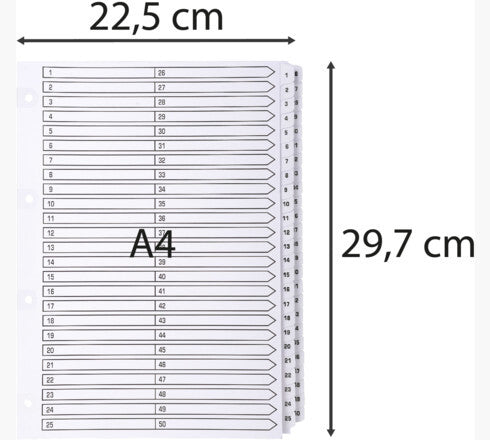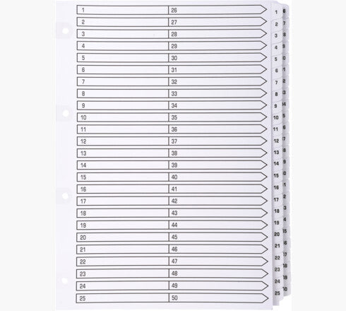The Exacompta Indices are made from 160gsm white card with white reinforced plastic tabs. The indices are A4 in size and are pre printed with 1 to 50.The indices are pre punched so they can be inserted in files and folders. Tabs printed on both sidesThe indices come with a printed index page for identifying contents. The indices come in 50 partsNumbered tabs 1 to 50