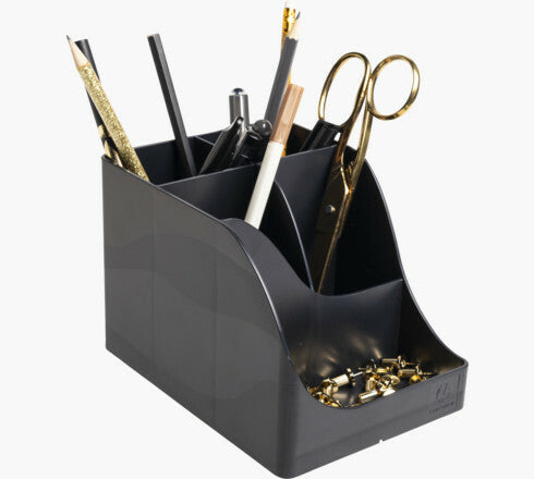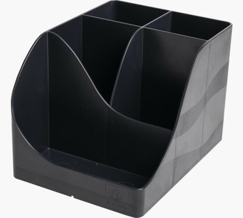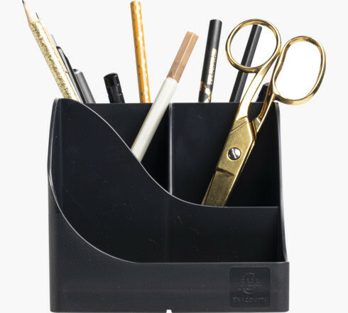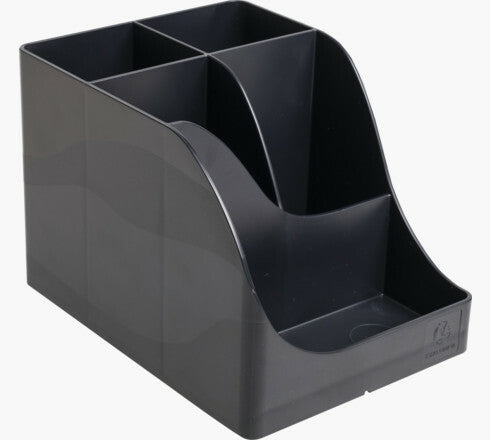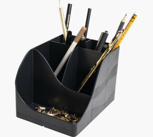 It offers 4 high compartments for large utensils: scissors, pens and 1 low compartment for small objects such as paper clips, drawing pins, USB key or even mobile phone.