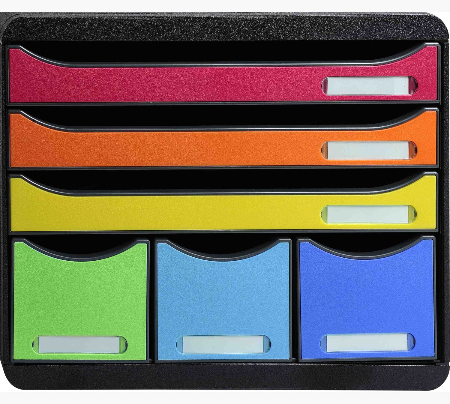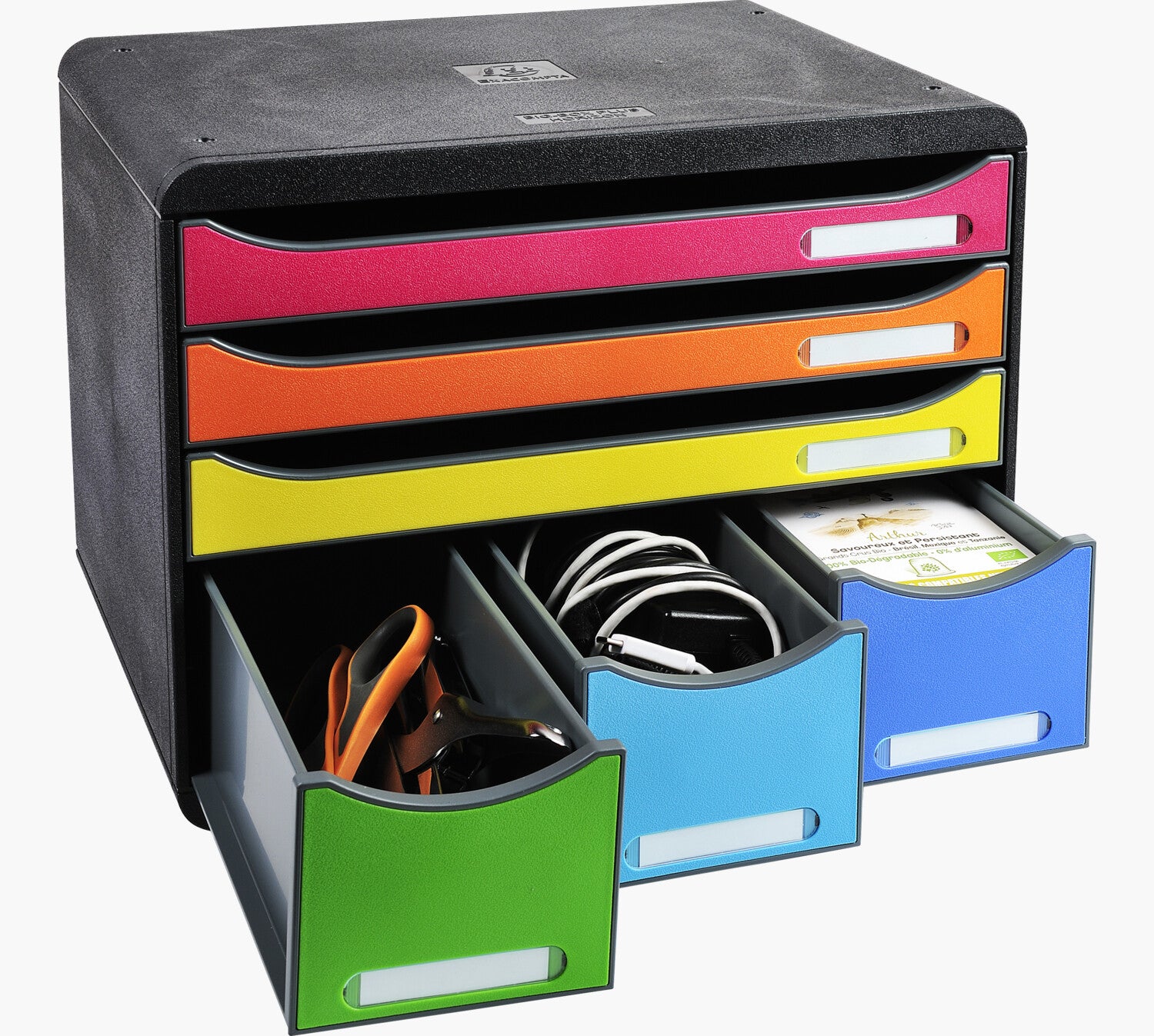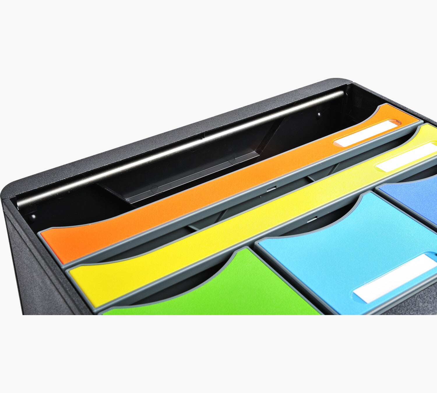 Drawer set with 6 drawers of 43mm, 3 drawers for storage of A4+ documents and 3 narrow but tall drawers for office stuff. Landscape format : fits perfectly on shallow cupboard or desktops (external depth = 27cm). Ideal for landscape documents like data sheets. Stackable through 4 notches. Open drawers allow to store documents without opening. Smooth drawer action with stop and label holders (included). A Monday Sunday Labels set included.