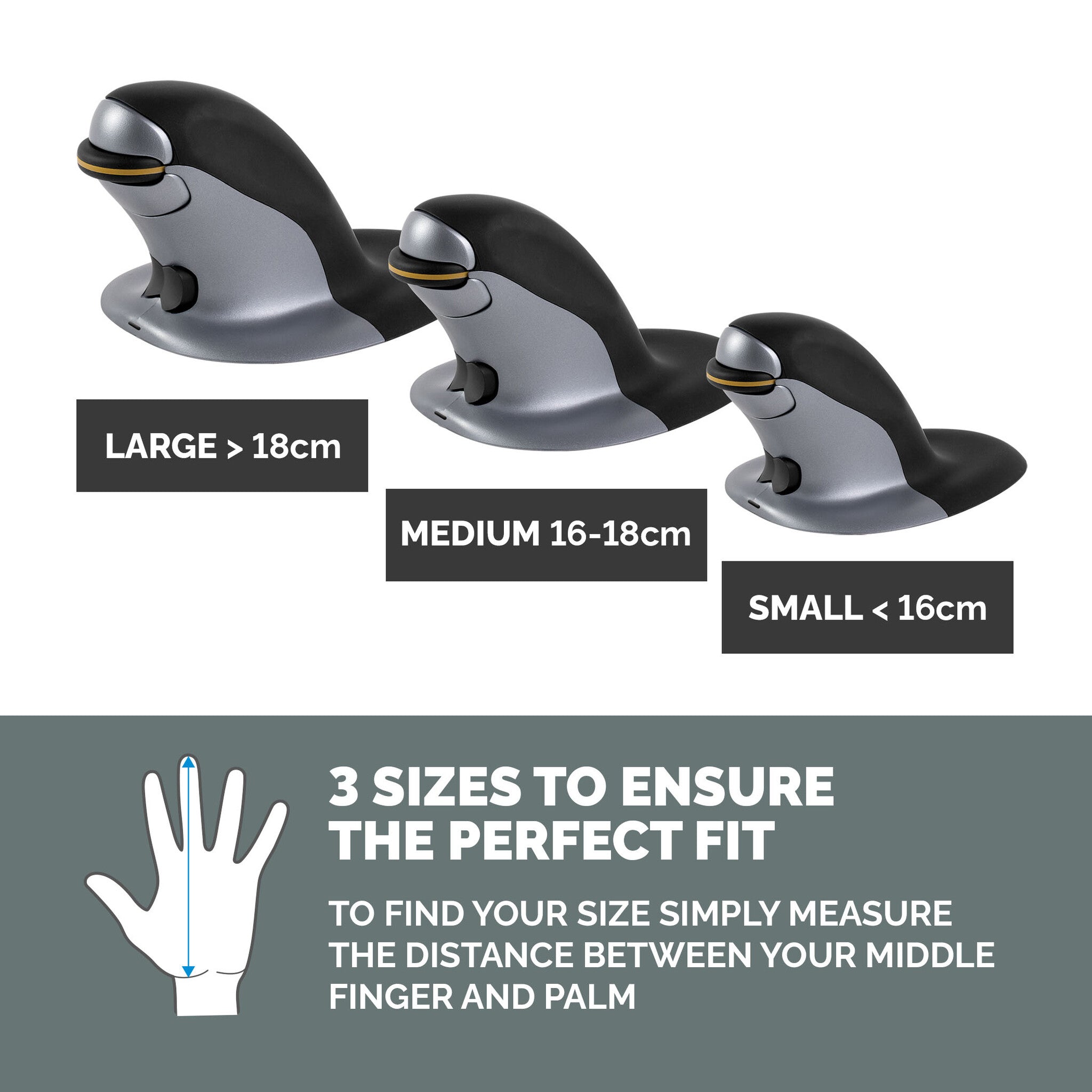 - CHOOSE YOUR SIZE - The Penguin mouse is available in three sizes. To choose the right one for you, measure your hand from the first fold on your wrist to the tip of your middle finger. Small 0-16 cm (approx. 0-6 inches)Medium 16-18 cm (approx. 6-7 inches) large 18 cm + (7 inches + approx.)