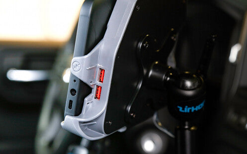 This is the new improved Samsung Tab Active2 docking station with dual powered USBs. Each USB port will deliver 1.5A of power and has an integrated cable restsraint system. The docking station is compact, lockable, and can be used with one hand. Easily connect this docking station to your vehicle with the cigarette lighter connector and this dock will provide power to your tablet's battery so it will stay charged and ready to go.