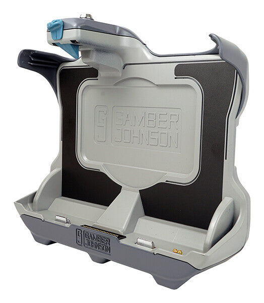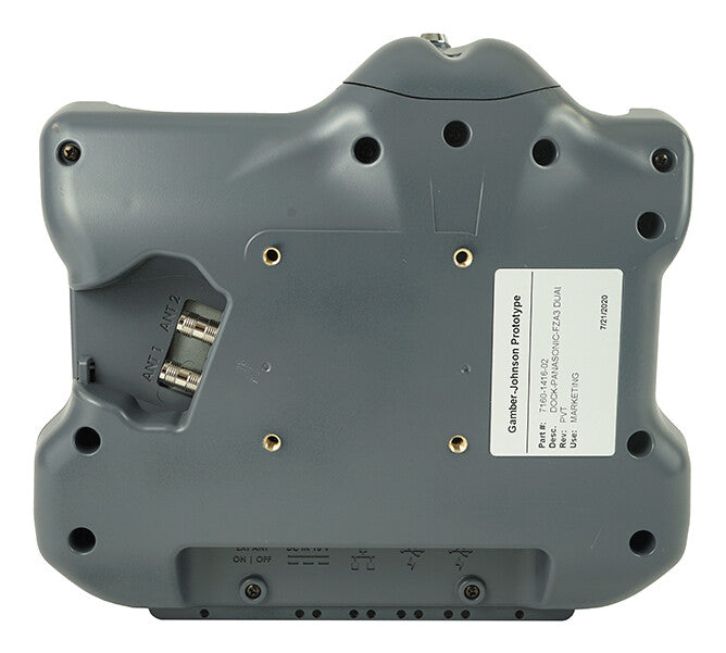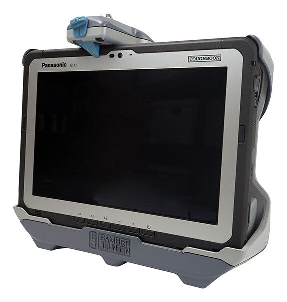 Gamber-Johnson’s Panasonic A3 Tablet docking station (Dual RF) accommodates the tablet’s hand strap with the extended battery. Port replication on this docking station includes dual powered USBs, an ethernet port, power input and an external antenna switch to control the use of an external antenna option. The front-located latch button makes one-handed docking/release very easy, attaches to most Gamber-Johnson motion attachments with the VESA 75mm mounting pattern.