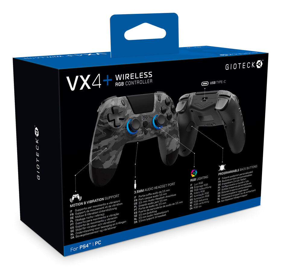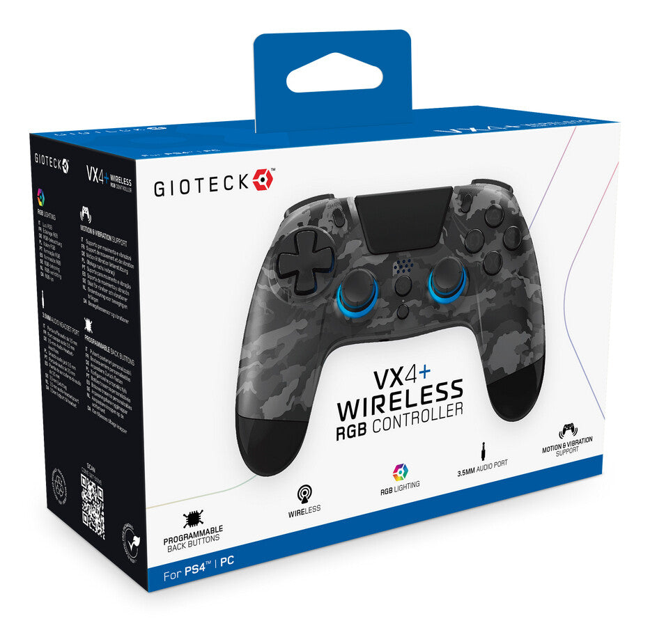 Upgrade to the latest version of our best-seller, the VX4+ Wireless RGB Controller for PS4 from Gioteck, now features customisable RGB lighting, enhancing your gaming experience. Quick-fire triggers, and a precise directional pad bring together lightning-fast performance.