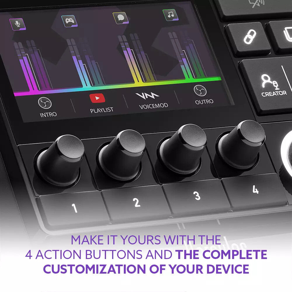 - Streaming management control: 4 action buttons and up to 8 assignable actions: start your stream, change scenes, change your voice, multiple mute, URL launcher, and more!