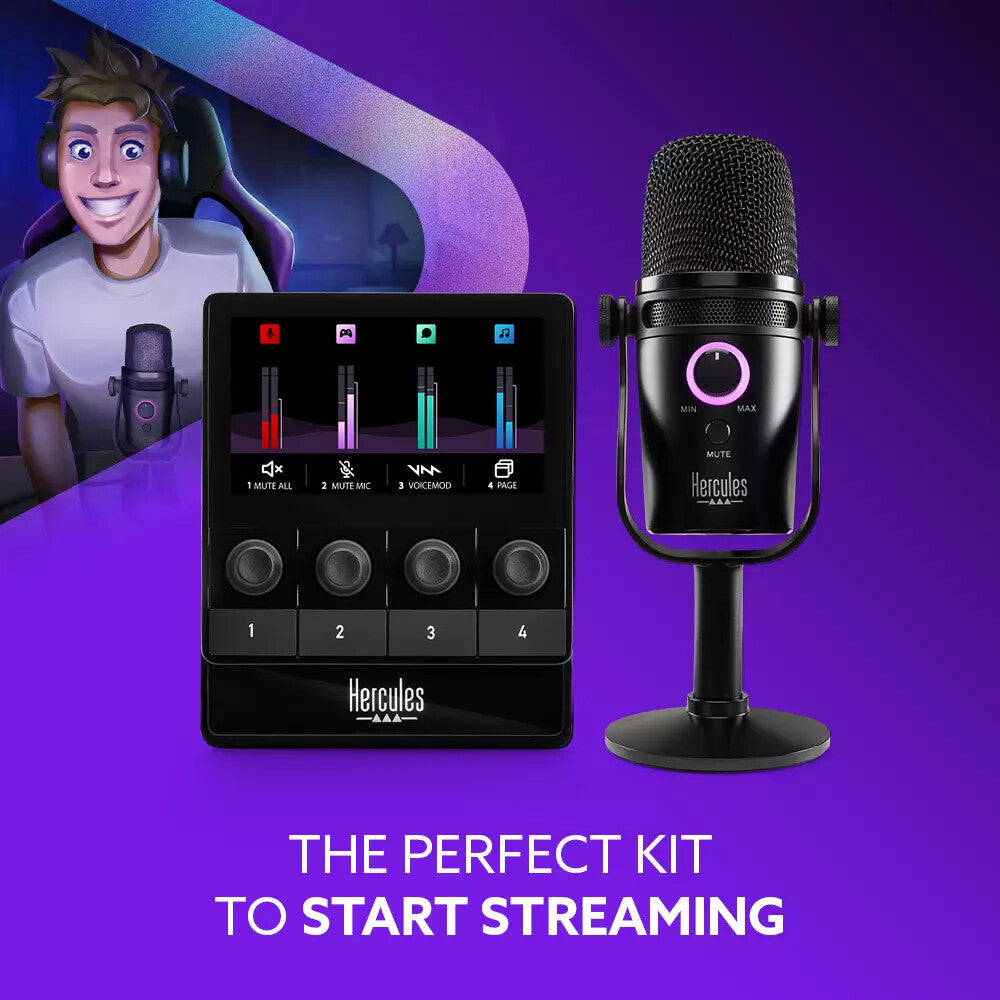 Hercules Stream Starter Kit is the perfect bundle to start streaming. With the Hercules Stream 100 and the new Hercules USB dynamic microphone, the HUD-600, you will have everything you need to control your voice and all your audio apps instantly.