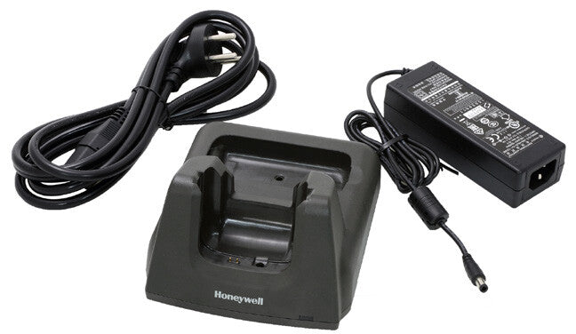 Charging cradle for recharging mobile computer and EDA60K-HB-2 battery. Kit includes dock, power adapter, and power cord for EU