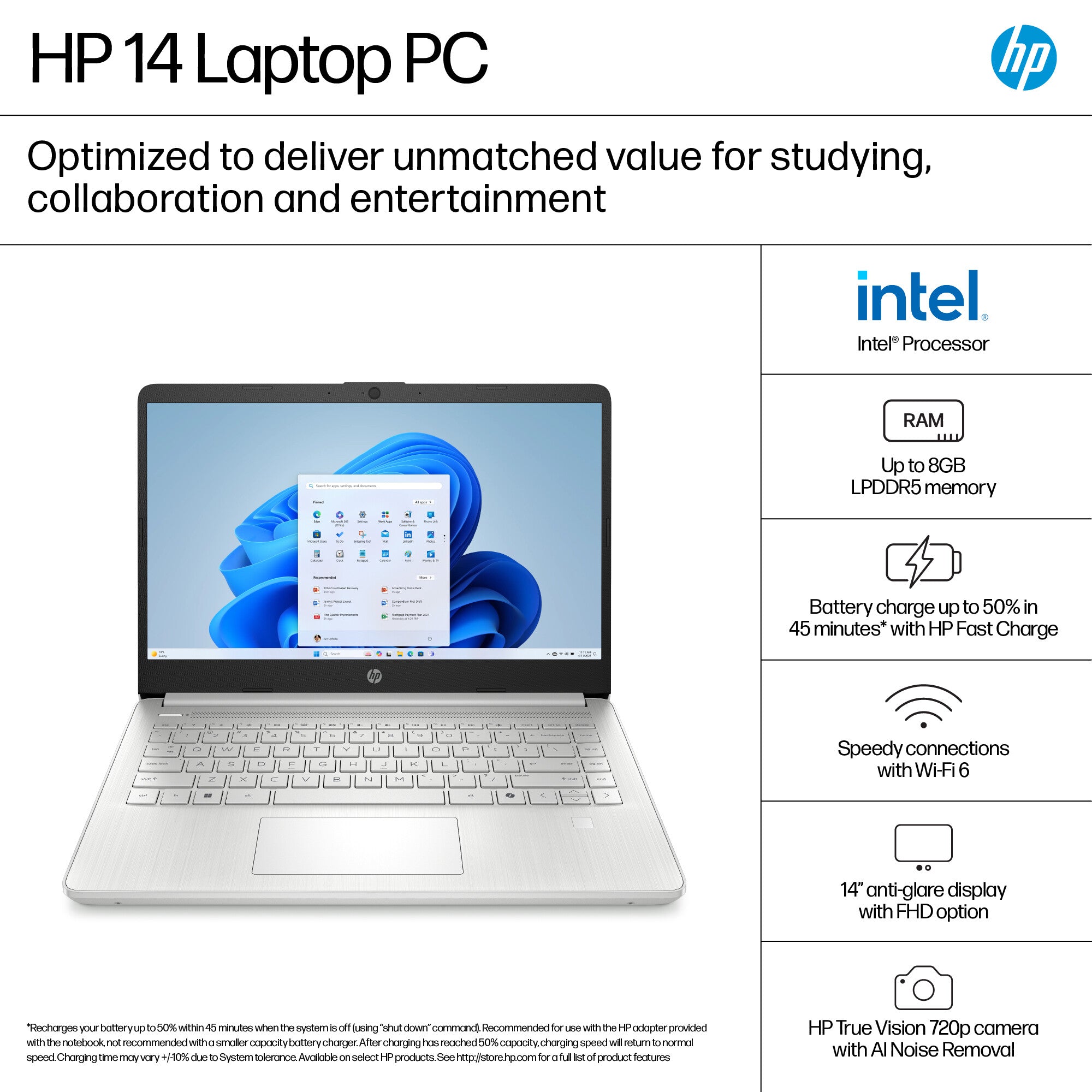 Go anywhere with the ultra-thin, lightweight HP 14" Laptop PC. Enjoy its micro-edge, flicker-free[1] display and the enhanced power of the Intel Core™ Series 2 Processor[2]. Leverage the AI assistant with the Copilot Key[3] and extend your productivity with a long battery life[4], HP Fast Charge[5], and precision touchpad for faster navigation.