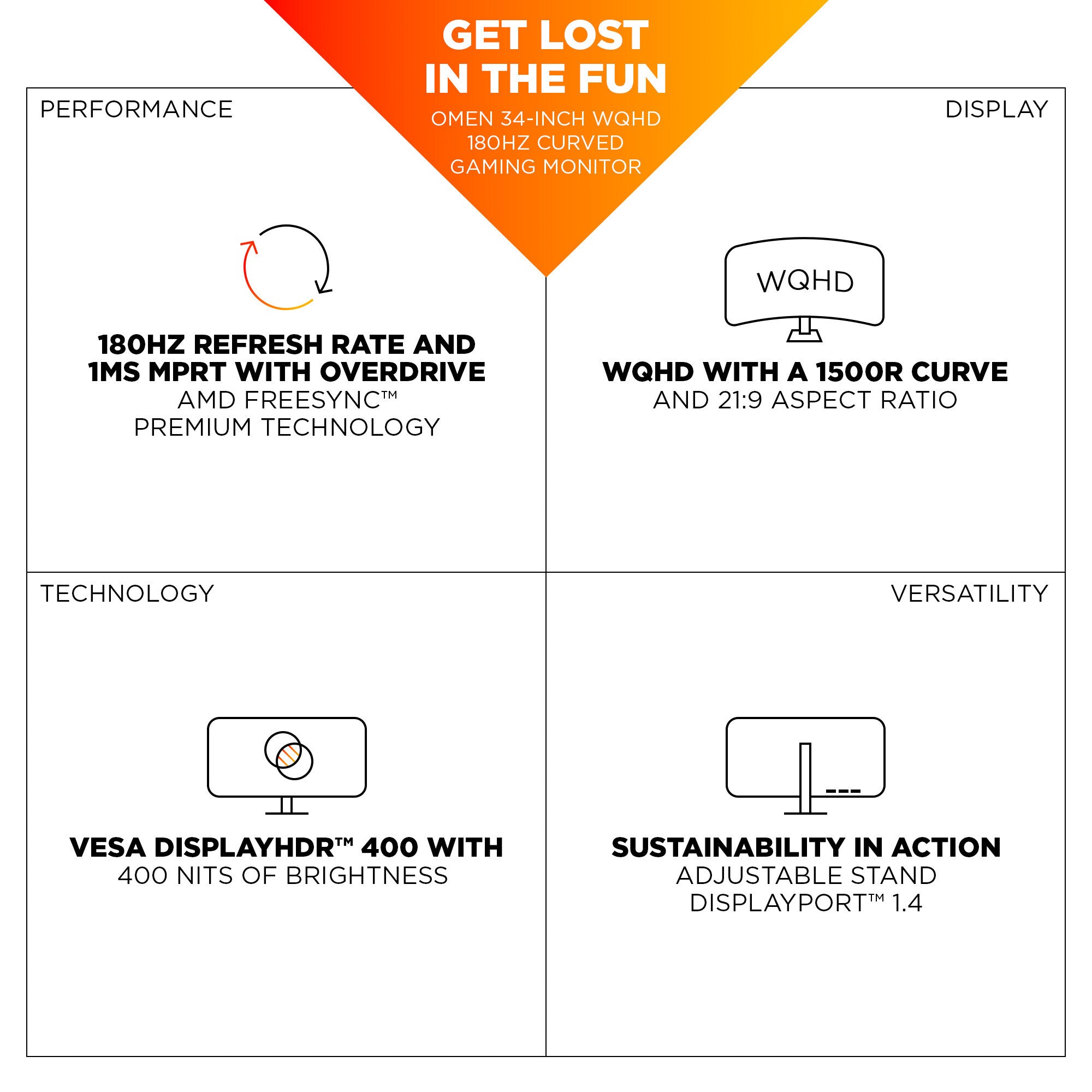 There is no better joy than fully escaping into the game. The OMEN 34-inch WQHD 180 Hz Curved Gaming Monitor brings the immersion with the ultrawide 1500R curved screen. Quick performance and realistic VESA DisplayHDR™ 400[1] color let you get lost in the games you love most, while the sleek design looks, sounds, and feels great on your desk.