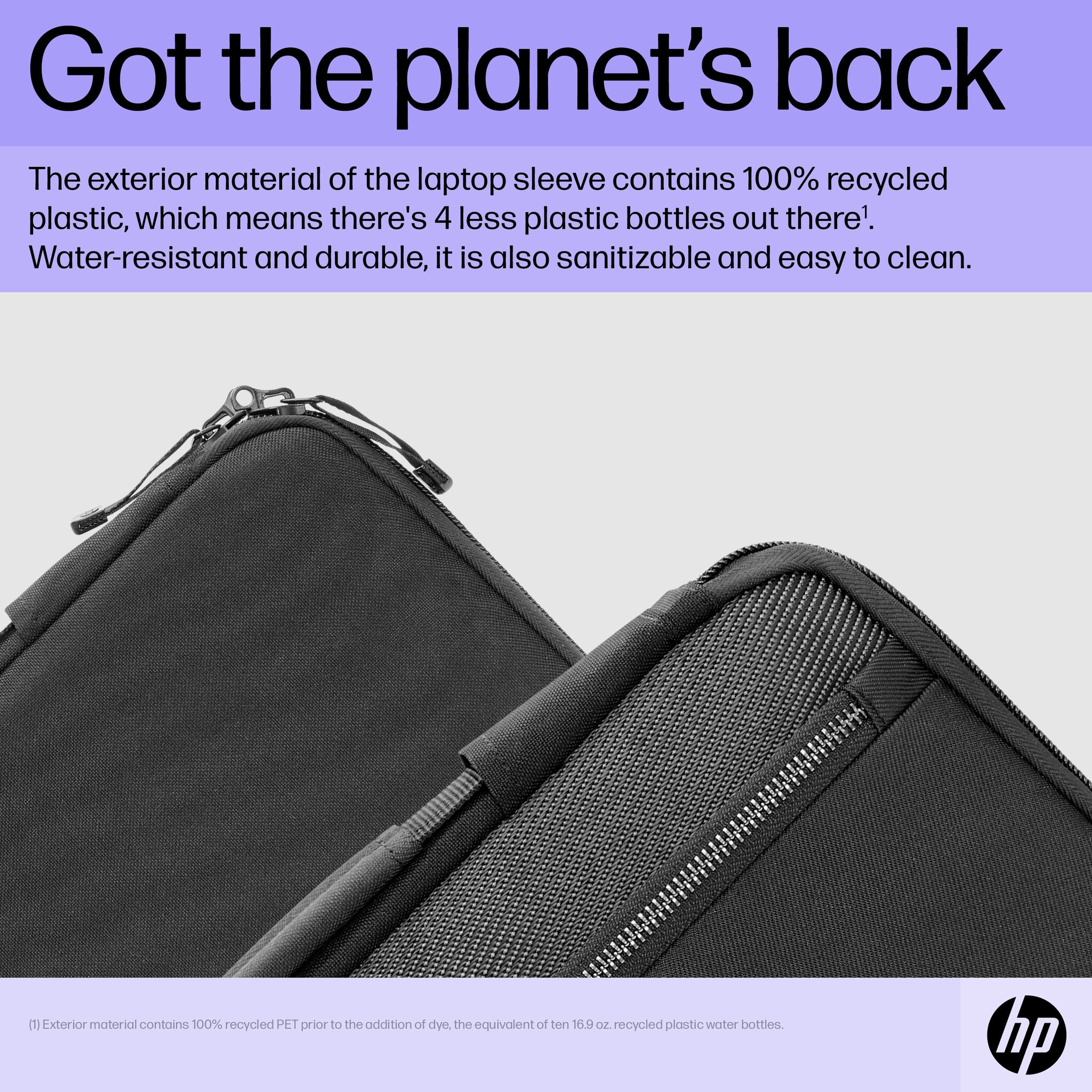 - Keep your devices protected and keep your commitment to the planet. The exterior material of the laptop sleeve contains 100% recycled plastic, which means there's 4 less plastic bottles out there[1]. In addition to being water-resistant, each laptop sleeve is made from durable, easy to clean sanitizable material[2].