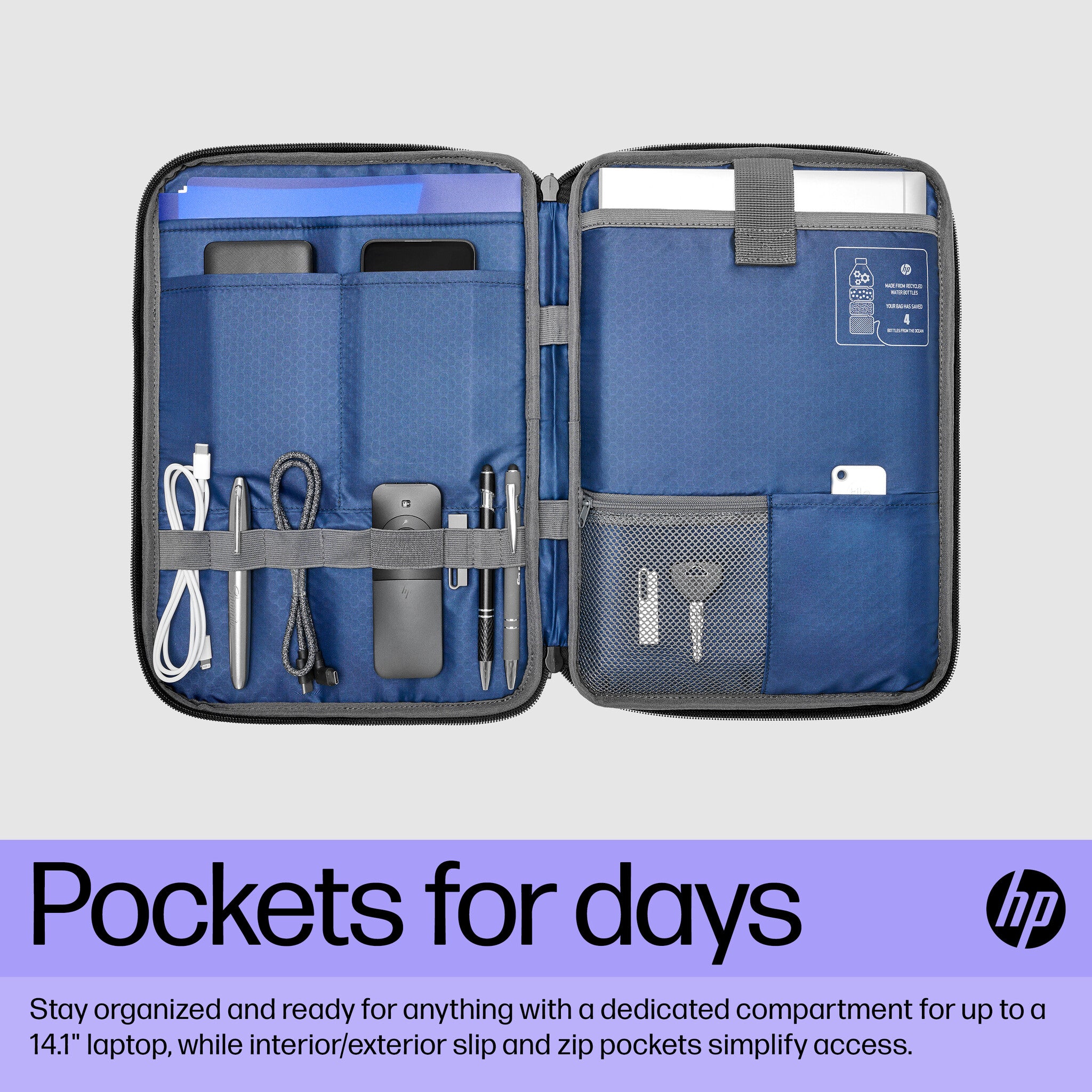 - With space for up to a 14.1” laptop and your accessories in dedicated compartments, this laptop sleeve keeps you organized and ready for anything--work, life or travel. Interior and exterior slip and zip pockets simplify access for easy packing and fast unpacking.