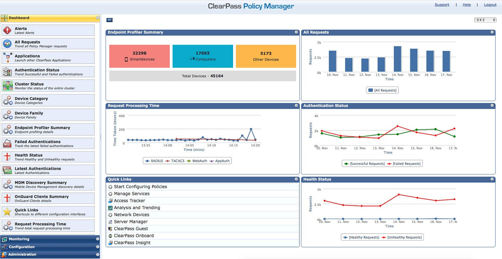 To simplify troubleshooting, endpoint control, and compliance reporting, ClearPass Policy Manager allows IT to centrally manage health-check settings and policies. Complete endpoint visibility: