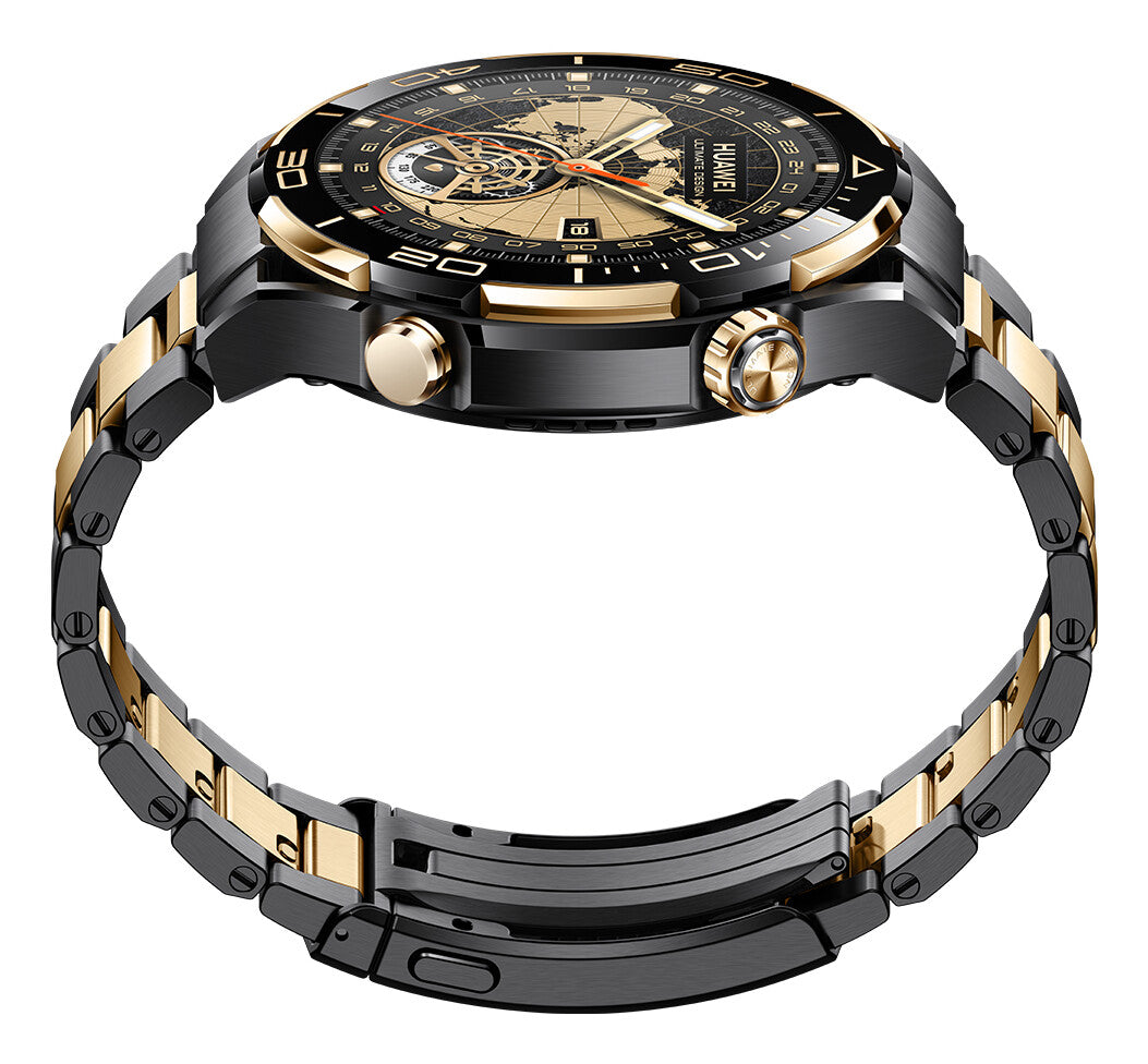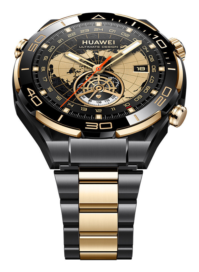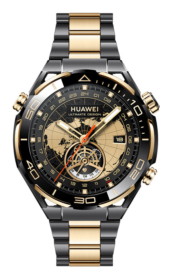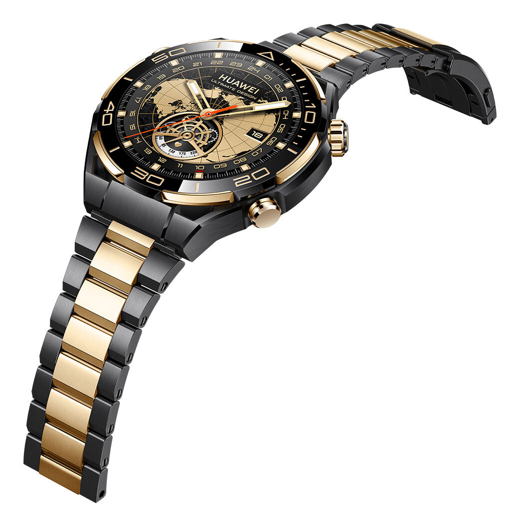 HUAWEI WATCH ULTIMATE DESIGN is your safe harbour in stormy seas, with its rudder-like black nanocrystal ceramic bezel and six 18K gold inlays, shining beacons guiding you through the night! Strap it round your wrist – it's ready to make a splash!