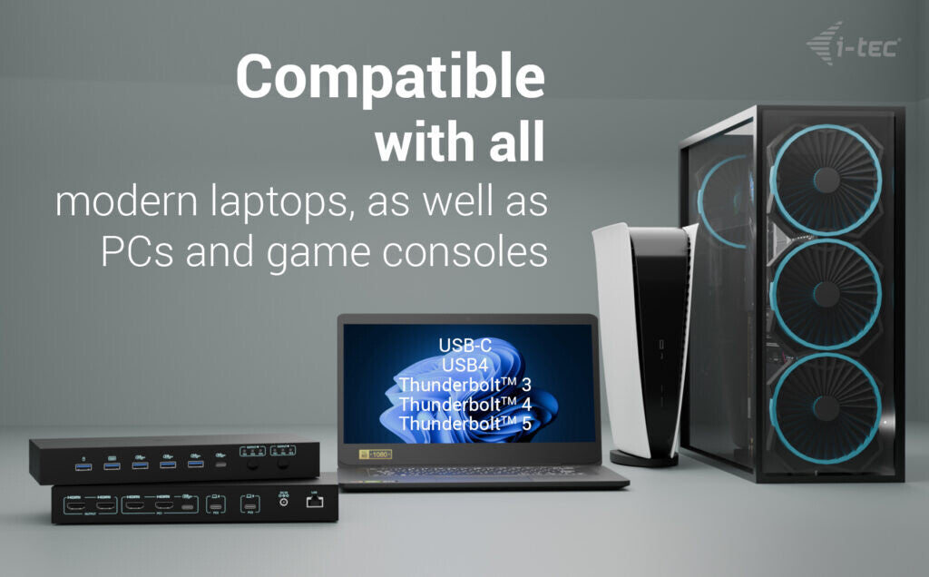 - Fully compatible with all laptops equipped with USB-C, USB4, or Thunderbolt 3/4/5 ports. A PC or gaming console can be connected via 1–2× HDMI and USB