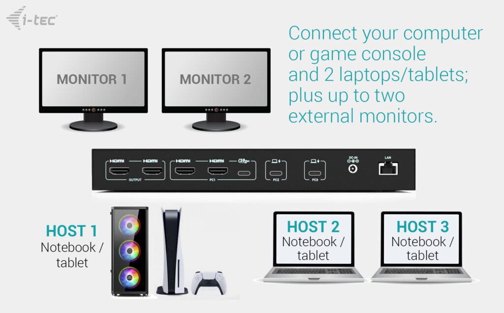 This high-performance docking station allows simultaneous connection of up to three host devices – one PC or game console and two notebooks or tablets. Fully compatible with devices featuring USB-C, USB4, or Thunderbolt 3/4/5 ports. PCs or consoles can be connected via HDMI and USB.