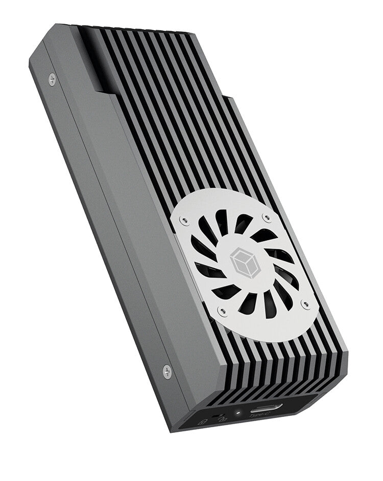 Thanks to the external USB 3.2 Type-C® enclosure IB-1922MF-C32 you can take one NVMe SSD with you easily enough. It allows access to M.2 SSDs of up to 2 TB no matter to which host you connect it. The IB-1922MF-C32 is compatible with M.2 cards of 30/42/60/80 mm length, it is operating system-independent and suitable for a variety of applications such as high-speed storage, cloning a drive or running a mobile operating system. A PCIe controller from Asmedia provides the NVMe inside the IB-1922MF-C32 with incredible transfer rates of up to 20 Gbit/s for reading and writing and gives your M.2 SSD longevity and efficiency.