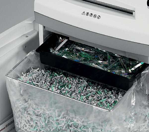 The multi functional shredder destroys paper, cds, dvds, floppy disks, staples, paper clips and credit cards. Integrated Auto Reverse Function for easy removal of jammed paper. User friendly thanks to i-control® function control. 2x2 cut & collect: separate cutting blocks for digital media incl. catchbasket. Silentec®: innovative sound dampening principle and EcoLogic for more energy efficiency.