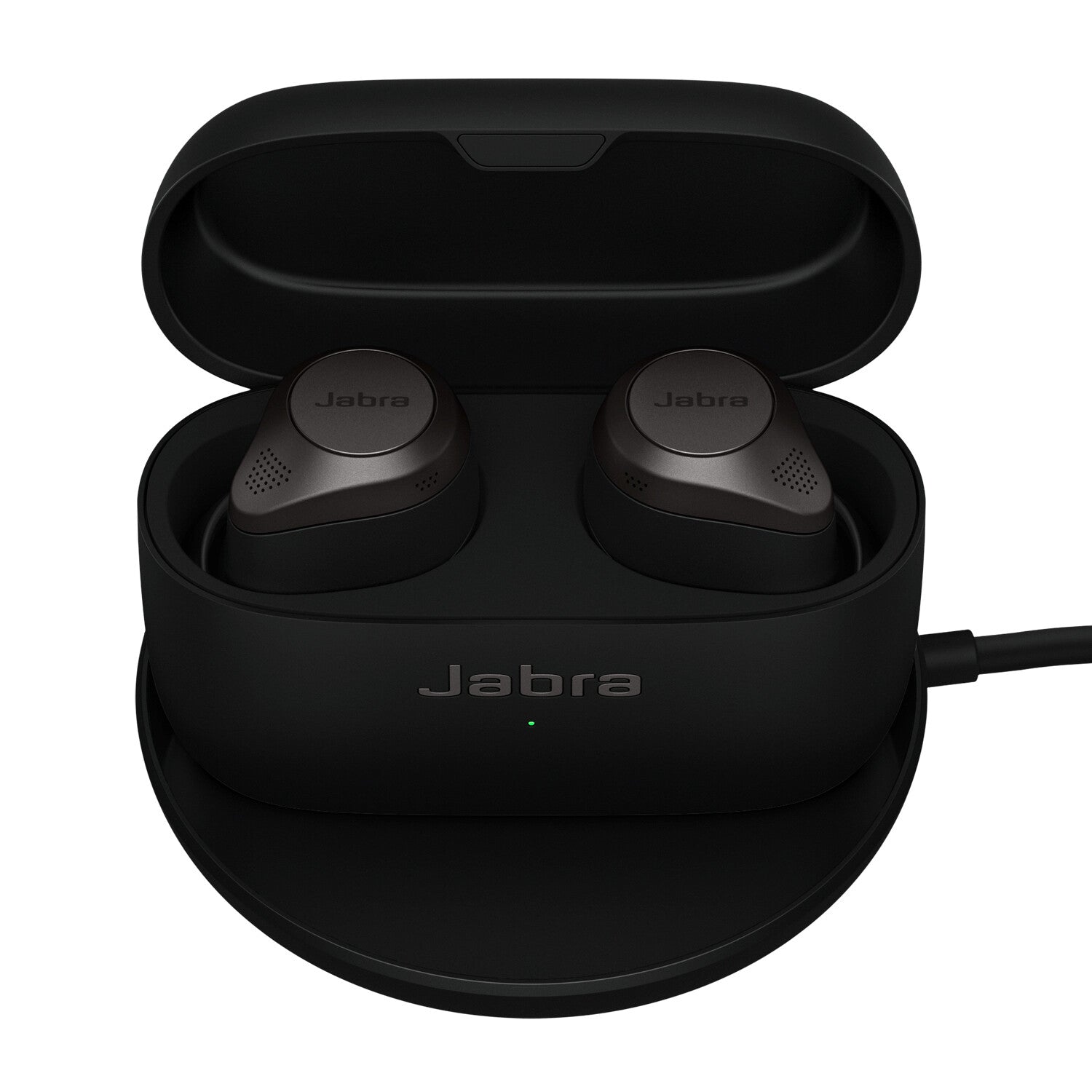Qi-certified Jabra Wireless Charging Pad, with USB-A cable. Compatible with all Qi-certified devices, and recommended for use with Jabra Evolve2 Buds, Elite 5 Connect 5t, Elite 7 Active, Elite 7 Pro, Elite 85t, as well as Elite 75t and Elite Active 75t wireless charging enabled variants.
