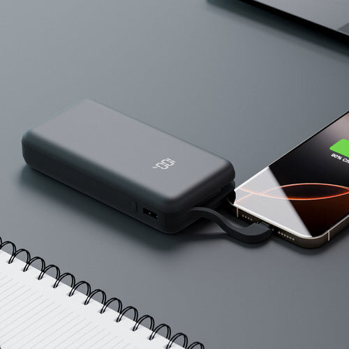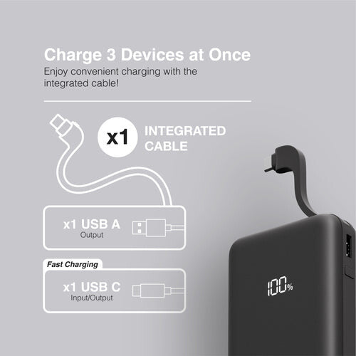The Juice Integrated Max Power Bank charges an average smartphone from 0-50% battery in only thirty minutes and holds five complete charges of an average smartphone. With a digital display that shows you remaining energy levels – you should never get caught out!