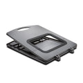 Keep your laptop running cooler and longer. The LiftOff™ Portable Laptop Cooling Stand lifts your computer off the desktop to promote airflow and reduce heat buildup, which improves the performance and life of the battery. Adjustable tilt and height settings allow you to put the screen where you want it, reducing neck and eye strain. The lightweight, collapsible stand has a built-in handle and fits into laptop carrying cases for up to 17” devices for fold-and-go portability. A non-skid base holds your laptop safely in place.
