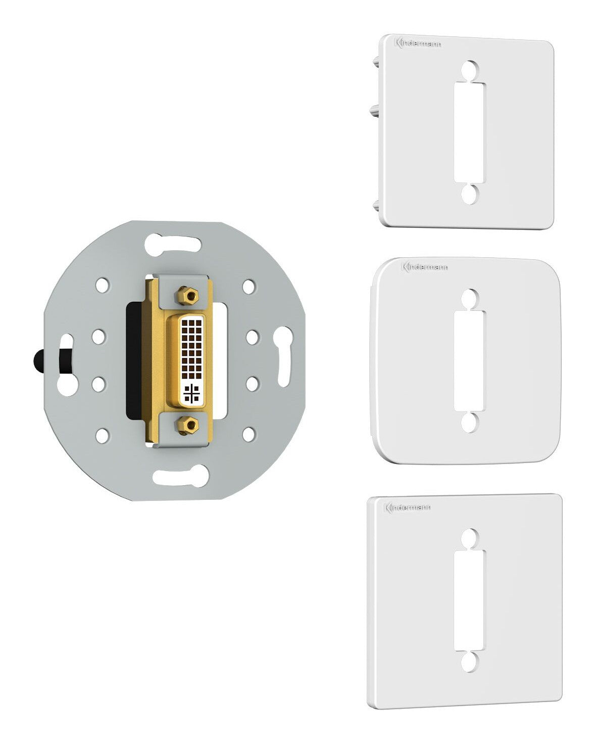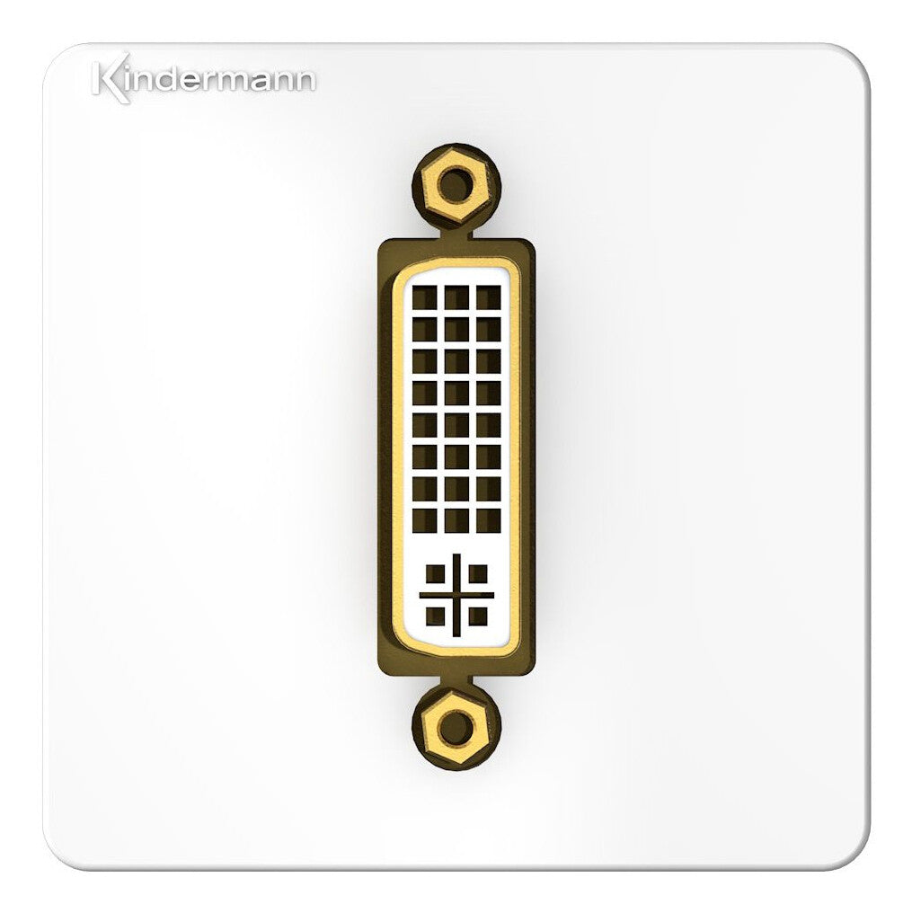 - Adapter plate with plastic cover in the sizes 50 x 25, 54 x 27, 55 x 28mm included in delivery, DVI-I (24 + 5-Pin), cable and plug connection, full size plate, RAL 9010 white.