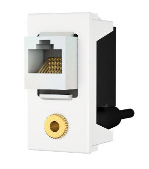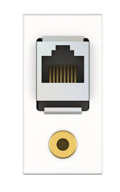 Cat-6A / Audio jack (3.5mm stereo), cable and plug conection, half size plate, plastic cover, RAL 9003 white, mounting without tools.