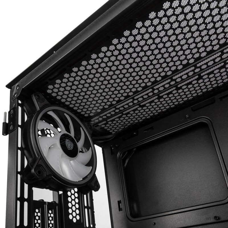 Aside from the pre-installed fans, users are also free to install two more 120/140mm fans in the roof, which is where a magnetic dust filter can be found installed on the honeycomb-style mesh. A full tempered glass hinged side panel shows off your system build, and is easily opened & closed using the pull tab. Magnets are used to keep the side panel in place when shut.