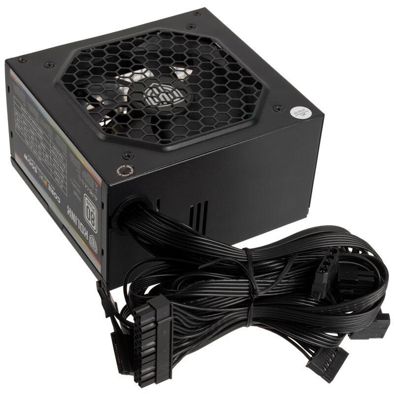 Kolink Core RGB 500 offers a continuous rated power of 400 W with a max rated power output of 500 W. The 500 watt model has a 4 + 4-pin EPS12V connector for the CPU, a 6 + 2-pin connector for the graphics card and a 20 + 4-pin ATX connector for the motherboard. Four SATA and two Molex connectors are available for additional components. The Kolink Core 500 ARGB can therefore easily power anything from a mid-range to performance system.