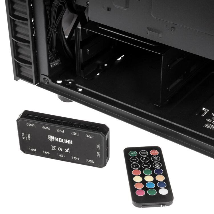 The digitally addressable RGB-LED fans, 4 of which are preinstalled, are controlled by the supplied remote & RGB hub. Alternatively, the fans can be hooked up and controlled using a compatible motherboard thanks to its use of a standard 3-pin (5VDG) connector. The tempered glass side panel allows users to enjoy a panoramic view of the lighting used inside the Kolink Observatory Lite Mesh.