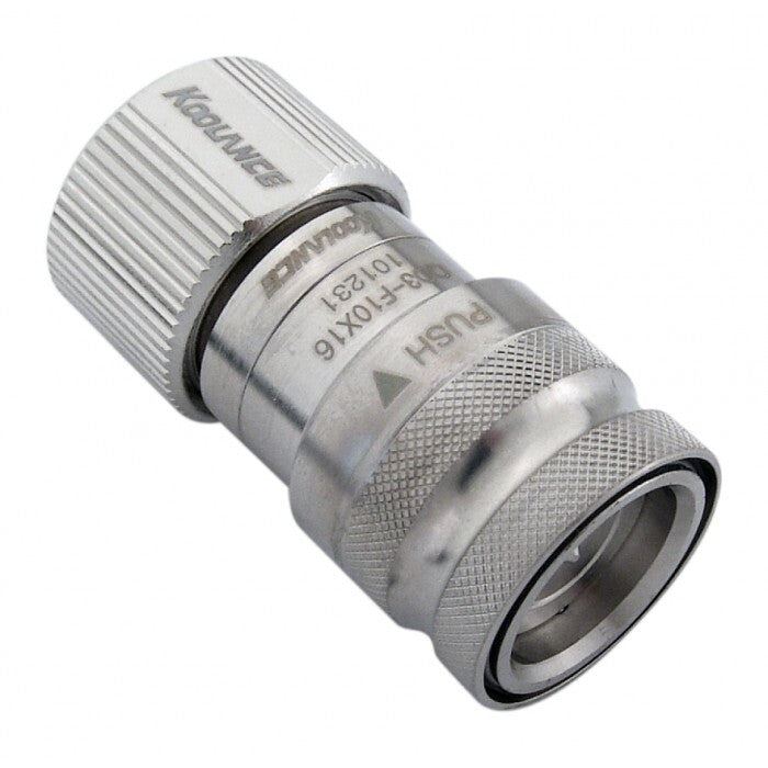 Koolance (patent-pending) quick disconnect no-spill coupling with automatic shutoff. 10mm (3/8") ID, 16mm (5/8") OD female straight connection with compression fitting. It will only fit a Koolance QD3 male quick disconnect.