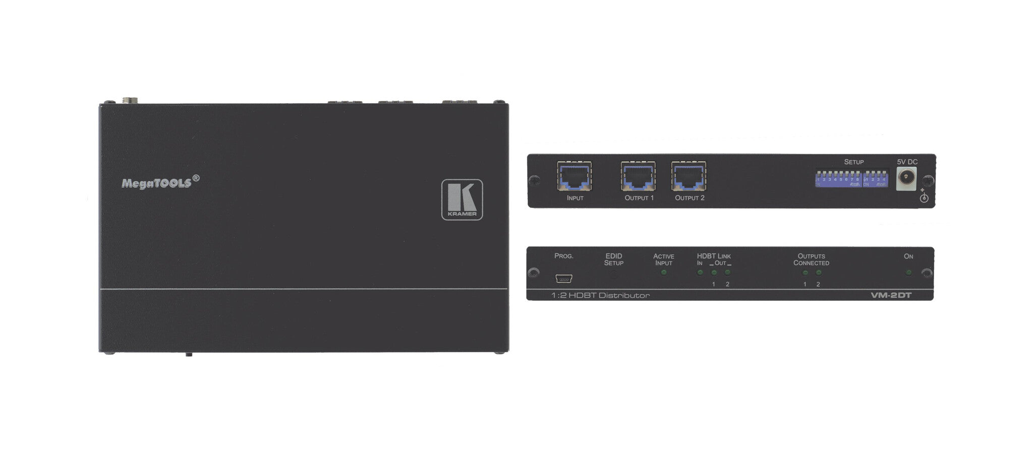 VM−2DT is a high−quality, long−reach 4K@60Hz (4:2:0) HDBaseT extender distributor that takes one long−reach HDBaseT input, equalizes and reclocks the signal and distributes it to two identical HDBaseT outputs. VM−2DT distributes native HDBaseT signals with up to 4K video resolution, along with their re−extension over HDBaseT.