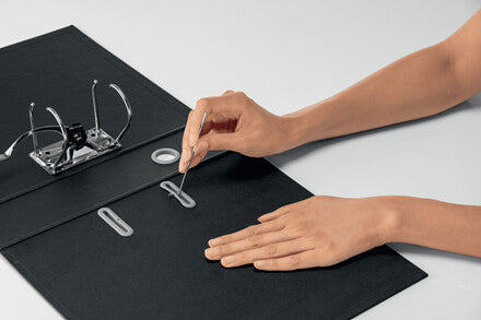 • Light grey recycled plastic thumbhole and rado rings for easy retreval and to secure the file when closed and upright