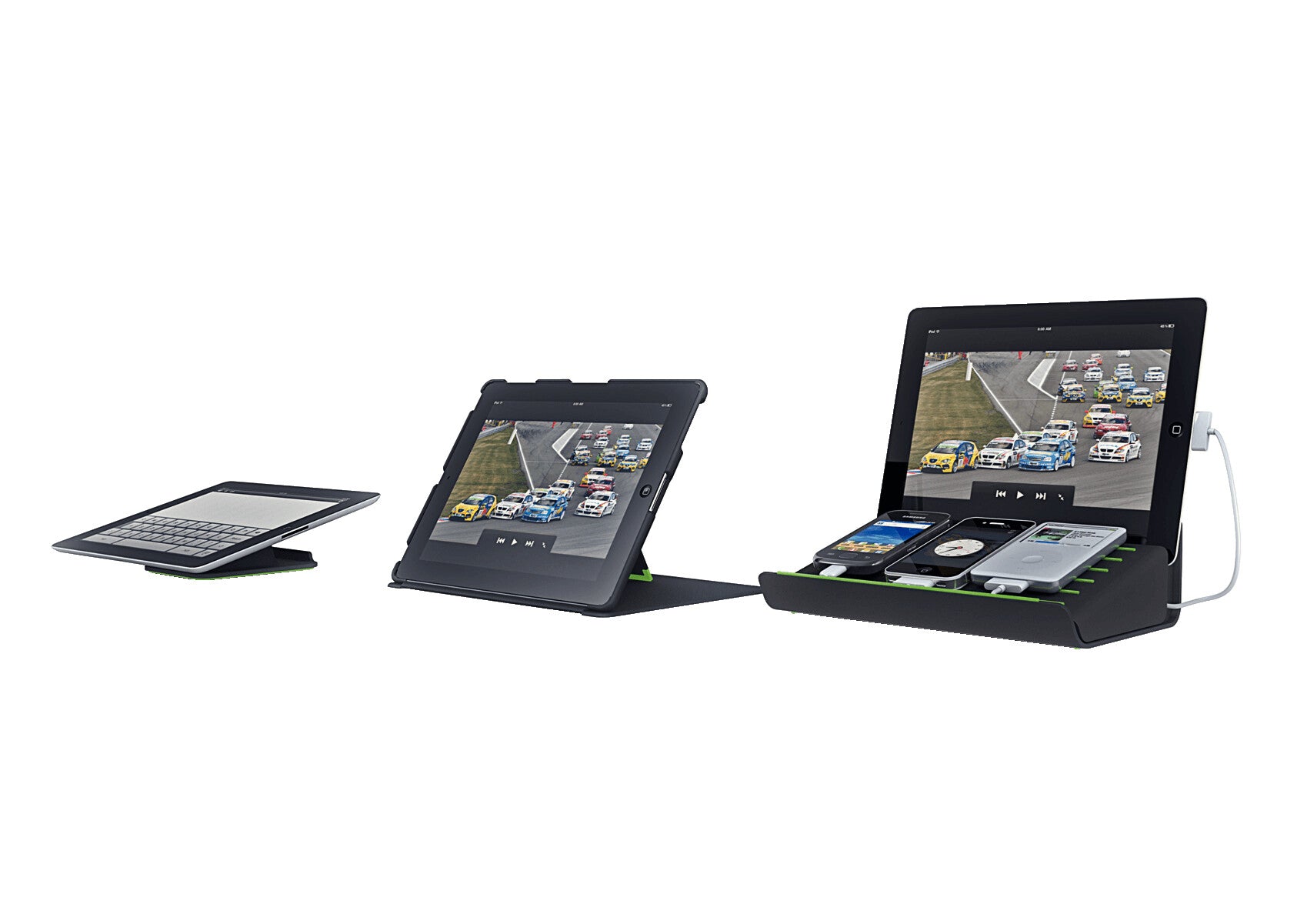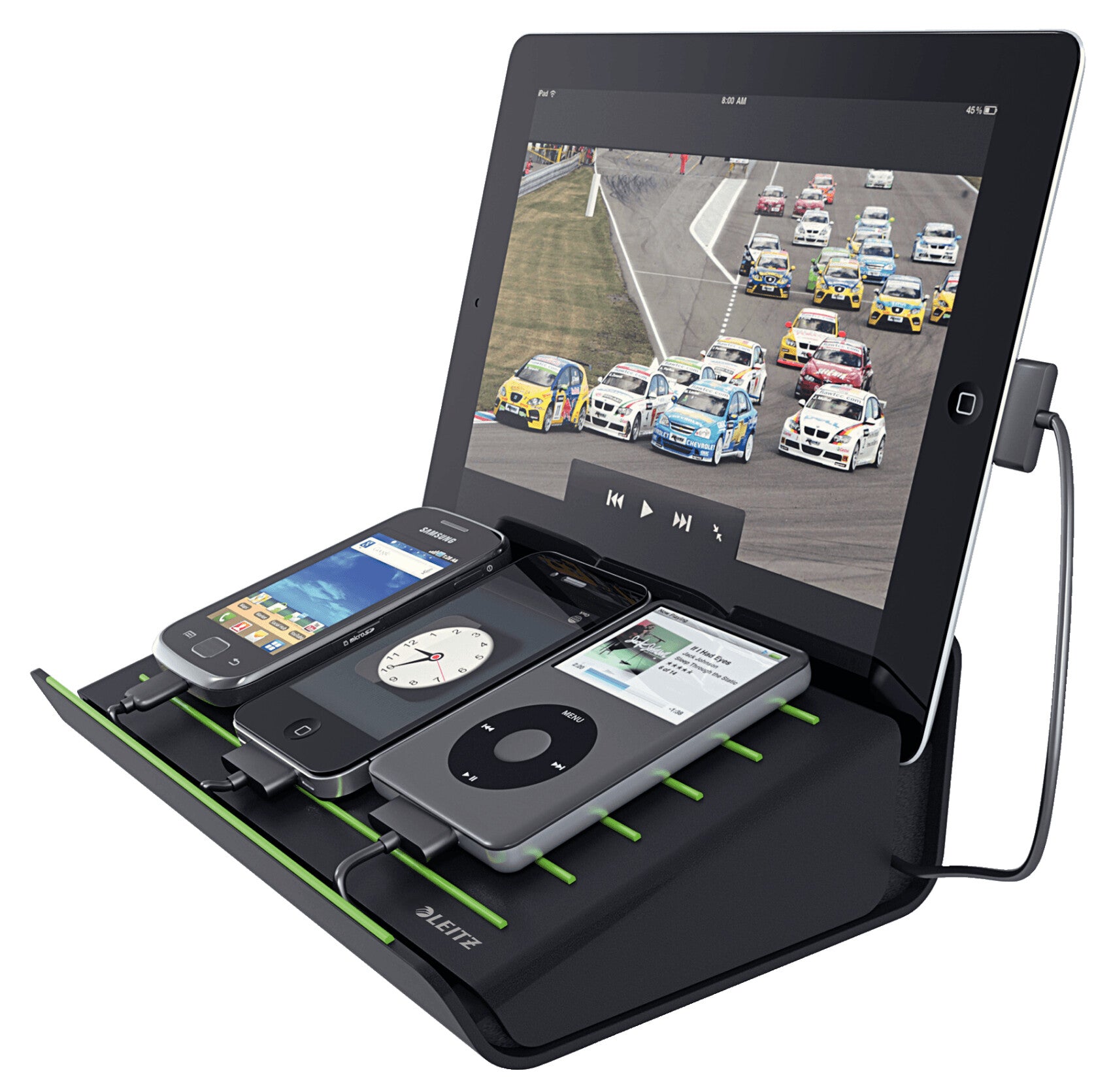 Unique multicharger for simultaneously charging mobiles, iPods and tablet PCs. You can even continue to work on your device during charging. Make your mobile devices complete!