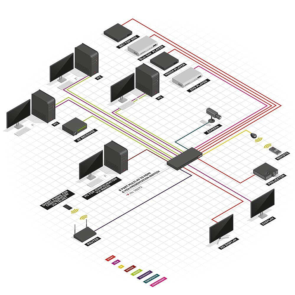 Featuring 8 AV inputs which can be converted and scaled to resolutions up to Full HD 1080p this AV Conversion Switch is an ideal addition to any meeting or conference room, lecture hall or auditorium. Any of the available inputs (3 x HDMI, 3 x VGA and Audio, Component Video and Audio and Composite Video and Audio) can be simultaneously shown across display equipment connected to each of the outputs (2 x HDMI and VGA). These three outputs provide compatibility with both current and legacy AV displays and can be combined with Lindy HDMI or VGA extenders to reach remotely located displays.
