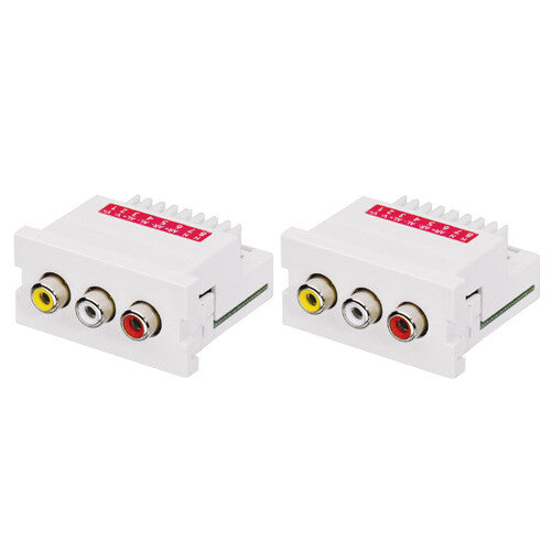 This set of two Phono/RCA Baluns are part of our Modular AV Extender Wall Plate System range that employs balun technology to extend a combination of audio and video signals over low cost Cat.5e/6 cable. Choose from a range of snap in modules, including VGA, RCA/Phono and S-Video combinations designed to be fitted to our single gang face plate or double gang face plate.