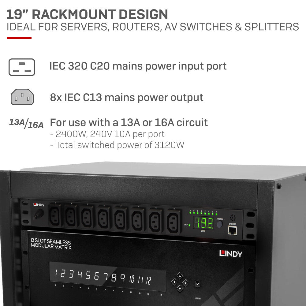 The Lindy IPower Switch Classic 8 is a power management solution which connects to an existing network infrastructure to provide convenient remote control power management from anywhere in the world with an internet connection. System administrators can control the power of multiple servers, workstations, hubs, router etc. allowing reboot and power-on and off functions, via a simple to use browser interface or software control.