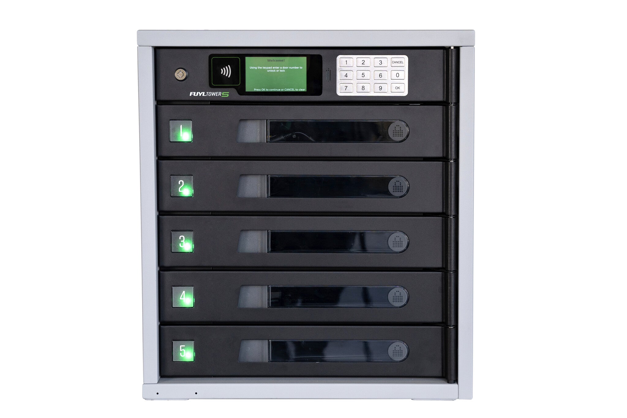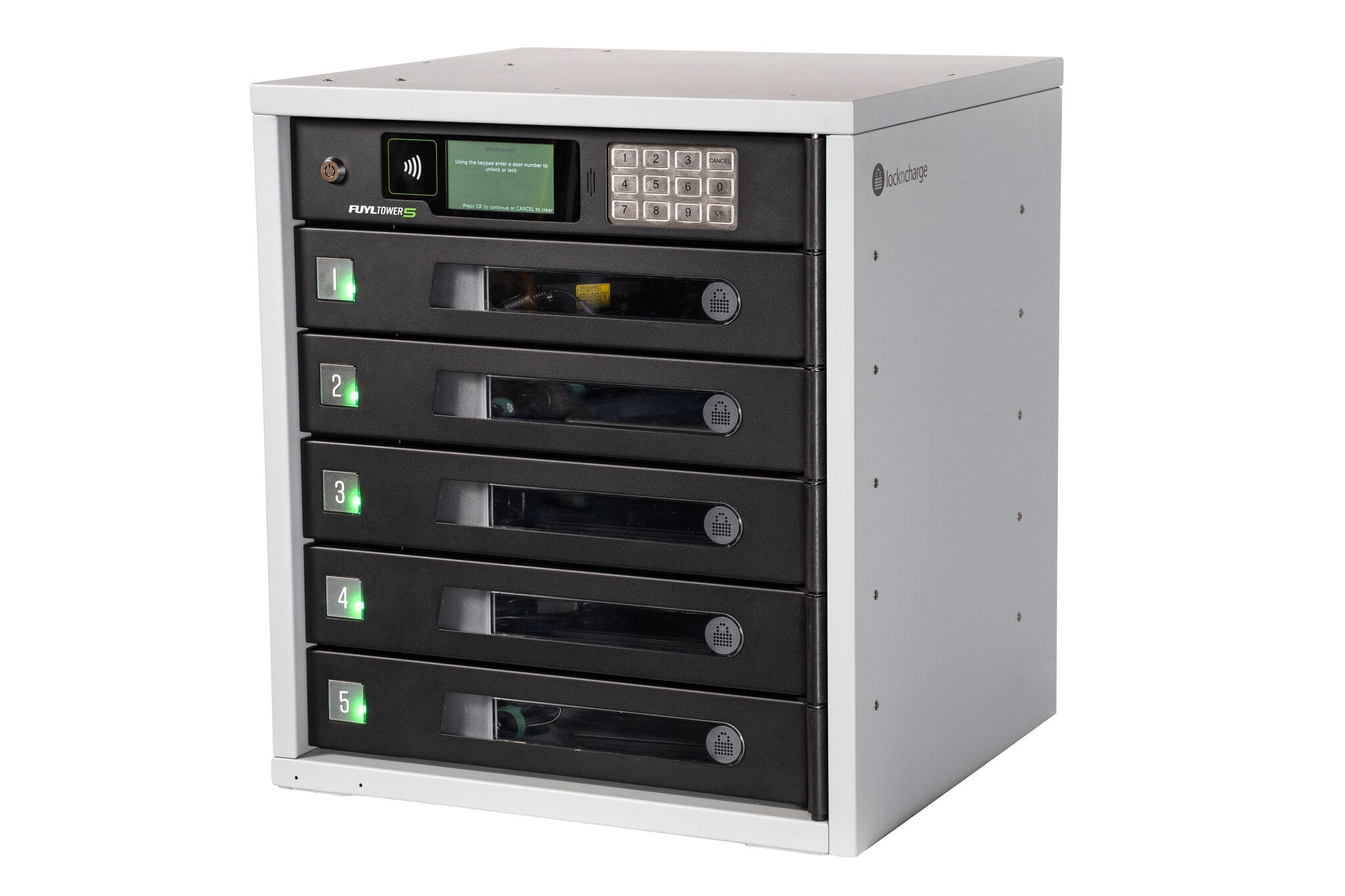 Intelligent Asset Management System that charges, stores, secures and manages assets for most mobile devices in 5 or 15 individually lockable compartments.