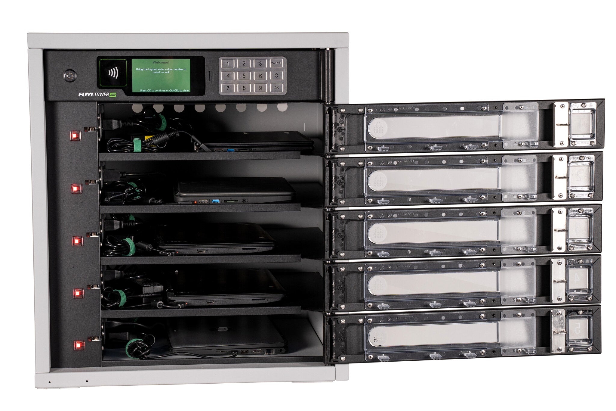 Network Connected. An optional Network Kit vastly expands the data transfer capabilities of the FUYL Tower 5 or 15 through individual Ethernet connections to each compartment. The Network Kit allows IT Departments to install a network switch to the top of a Tower and connect devices from each bay to a network, making it possible to re-image devices remotely.