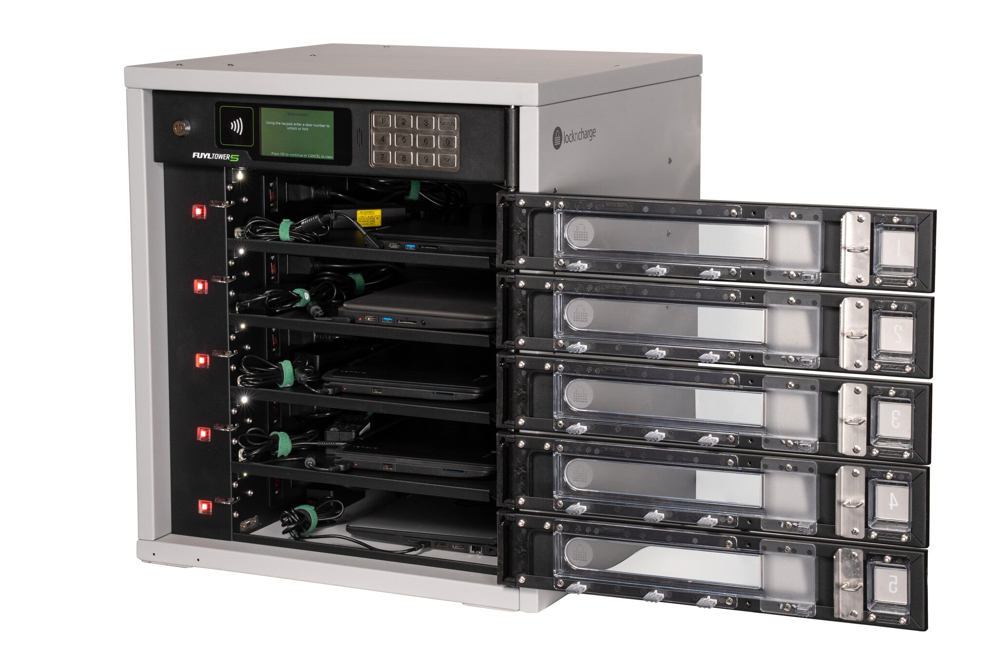 Compatible & Efficient Charging Lockers. All 5 or 15 compartments are equipped with a power outlet and a 2.4 amp USB port, so you can charge almost any device, including: iPads, tablets, laptops, mobile phones, Chromebooks and more1.
