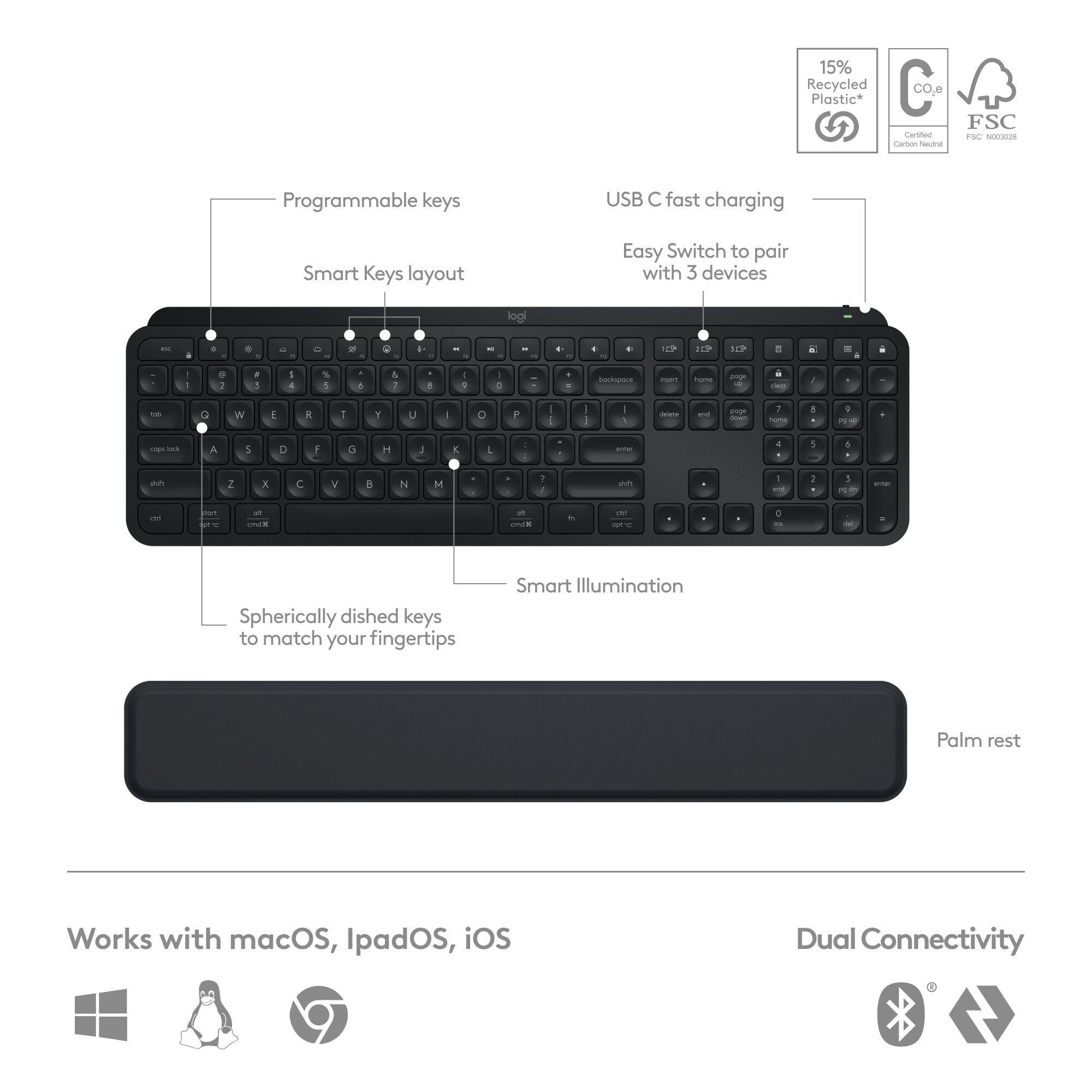 - Smarter Illumination: Backlit keyboard keys light up as your hands approach and adapt to the environment; now with more lighting customizations on Logi Options+