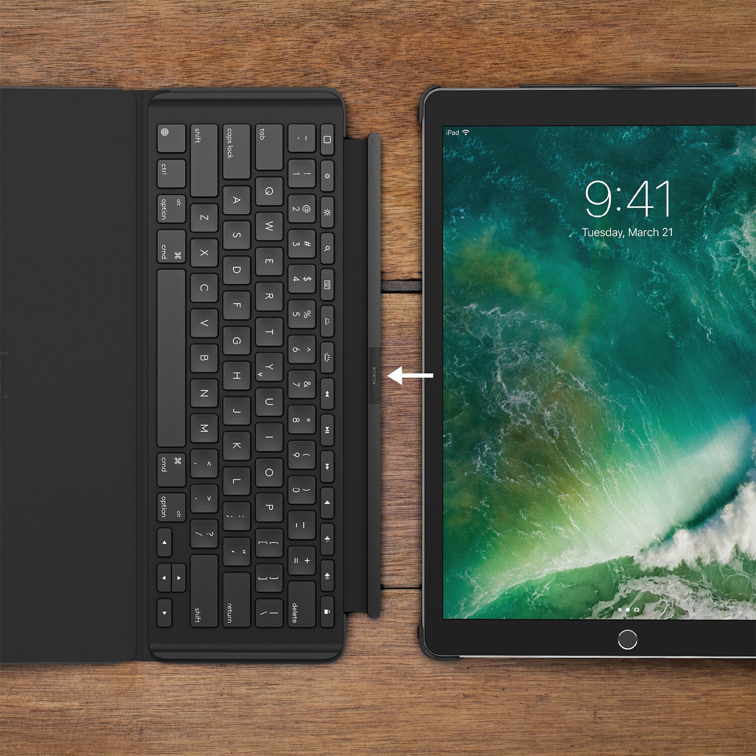 Slim Combo has been designed specifically for the 12.9 inch and 10.5 inch iPad Pro. The keyboard has no charging cable, batteries, or blinking indicator light – getting all of its power directly from iPad Pro. It uses minimum power – 0.3%-2.3% of iPad Pro battery for every hour of typing. Plus, any iOS updates are communicated directly to your keyboard via Smart Connector.