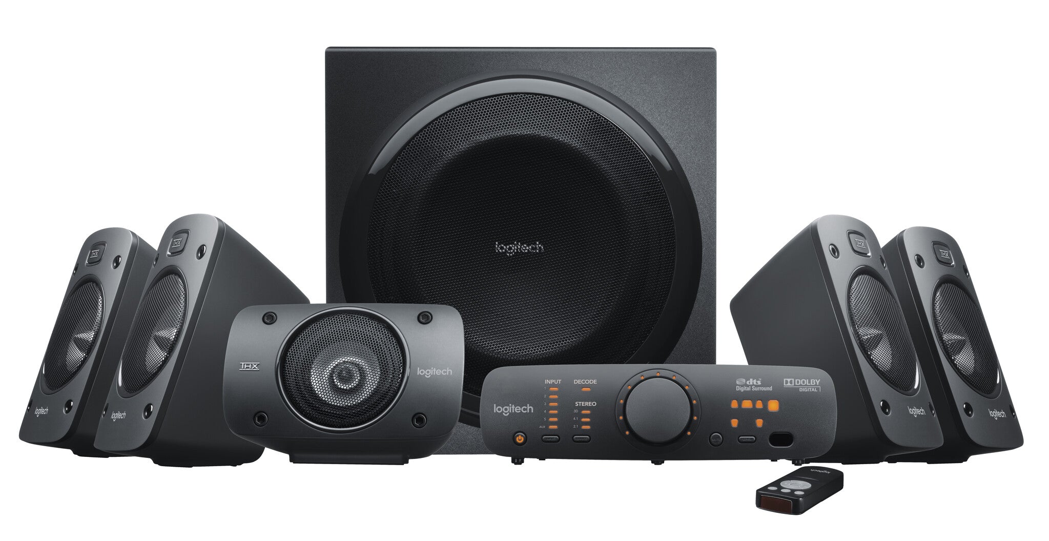 Logitech® Surround Sound Speakers Z906-hear every detail, all around you, in theater-quality sound. 500 watts (RMS) of thunderous audio turns any night into opening night. THX® Certification gives you quality you can count on, while onboard 5.1 digital decoding immerses you in your favorite movies as you hear every detail of Dolby® Digital or DTSTM encoded soundtracks in surround sound-from the roar of the crowd to the footsteps right behind you. You can connect up to six components simultaneously, including your TV, Blu-ray™/DVD, player, DVR, Xbox 360®, PLAYSTATION®3, Wii®, iPod® and stereo. With its easy-to-read display and easy-to-stack design, the control console fits right in with the home-entertainment setup in your living room. And a wireless remote lets you control your listening experience without ever getting off the couch.