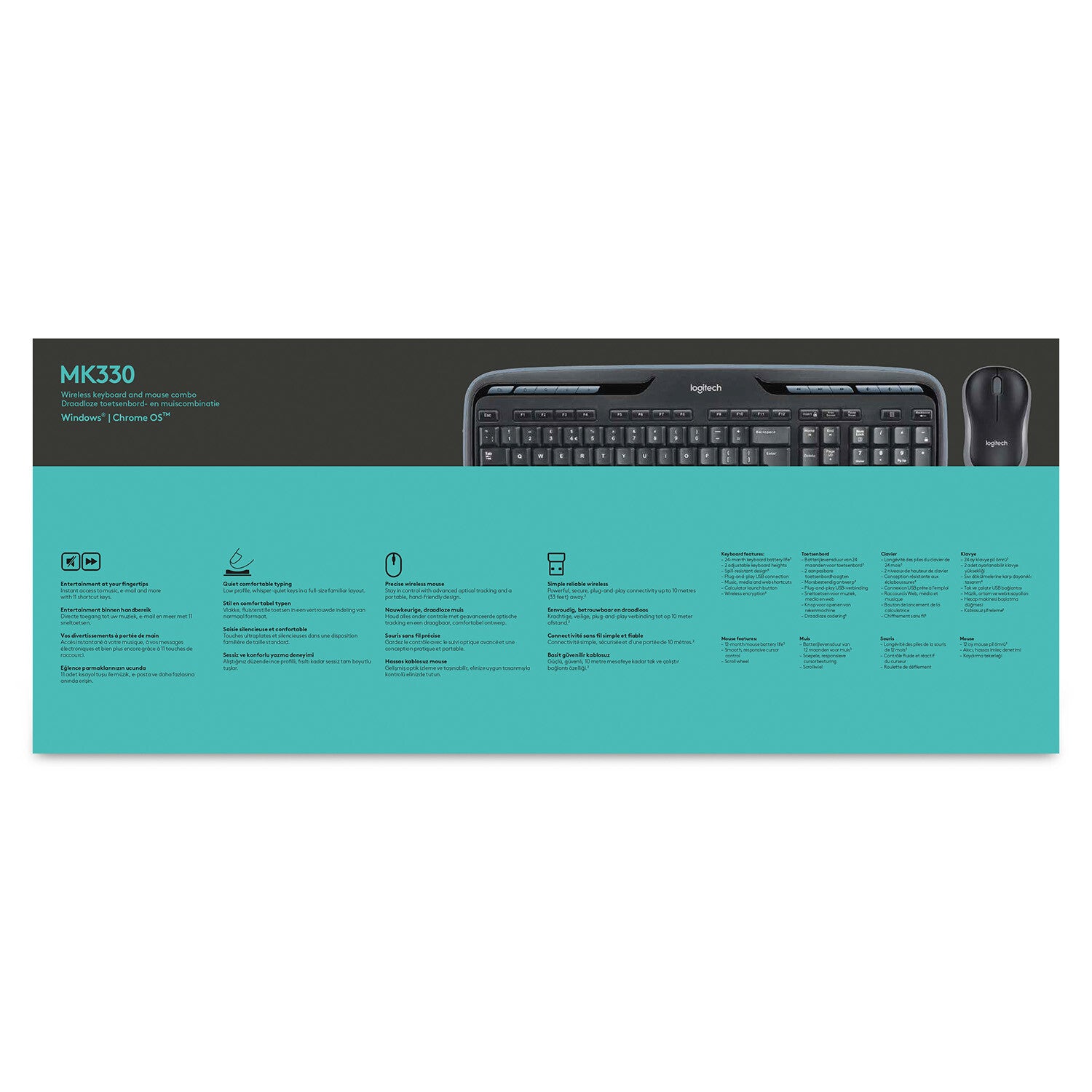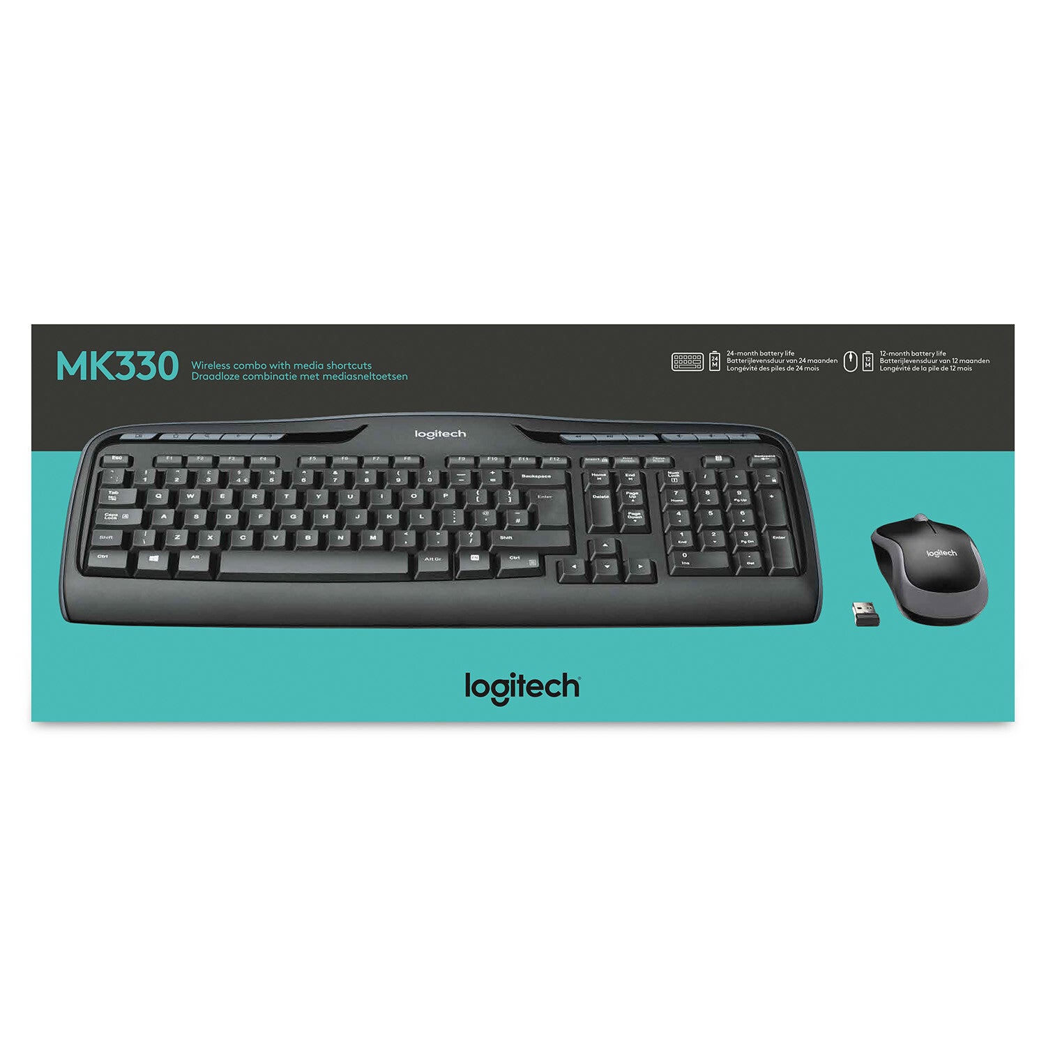Logitech® Wireless Combo MK330. The combo that puts entertainment and portability at your fingertips. With 11 hot keys and 4 programmable F-keys, you’ll enjoy instant access to the things you do most. Low-profile, whisper-quiet keys help make typing IMs, emails nice and easy. The mouse features storage for the tiny Logitech® receiver, so you can take your mouse wherever you go. 24-month keyboard and 12-month mouse battery life—with auto-sleep and on/off switch—lets you go years without the hassle of changing batteries.* And the simple software-free setup will have you on Google, Amazon or Netflix in no time.