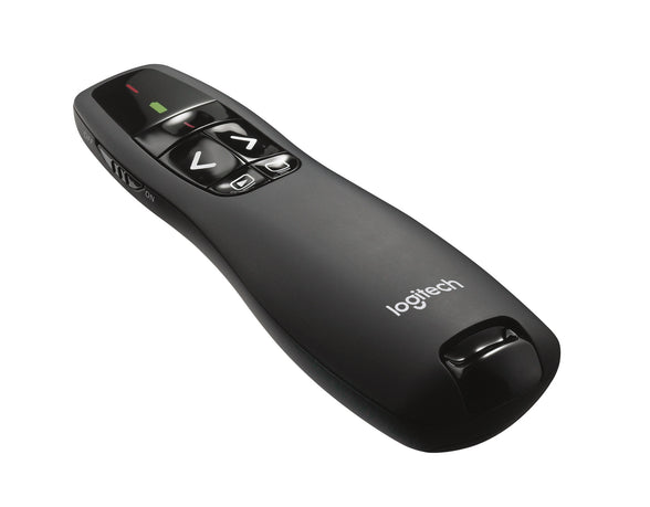 Logitech® Wireless Presenter R400 is designed to help you make your point. Its intuitive slideshow controls help you navigate through your presentation with confidence. Buttons are easy to find by touch. And its shape feels great in your hand. It’s got a red laser pointer that’s easy to see against most backgrounds and a range of up to 50 feet (15 meters), so you’ve got the freedom to move around the room and mingle with your audience. A storable plug-and-play wireless receiver makes it simple to get started—there’s no software to install. And when you’re through, the receiver stores inside the presenter to make packing up easy.