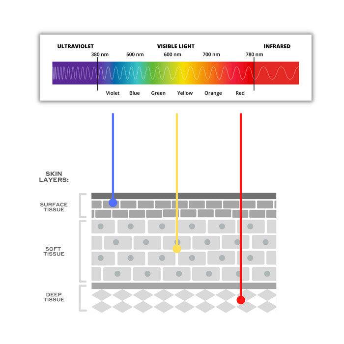 LED Light Therapy targets the skin. Different colours on the visible light spectrum have different wavelengths. Depending on how long or short these wavelengths are, they penetrate the skin at different depths, triggering different responses.